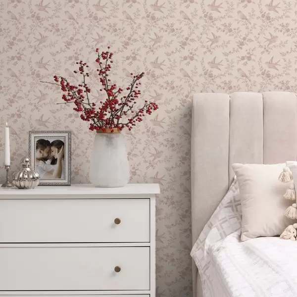Tapet Fugler og roser, vintage mønster på pudderrosa Nr. a00587