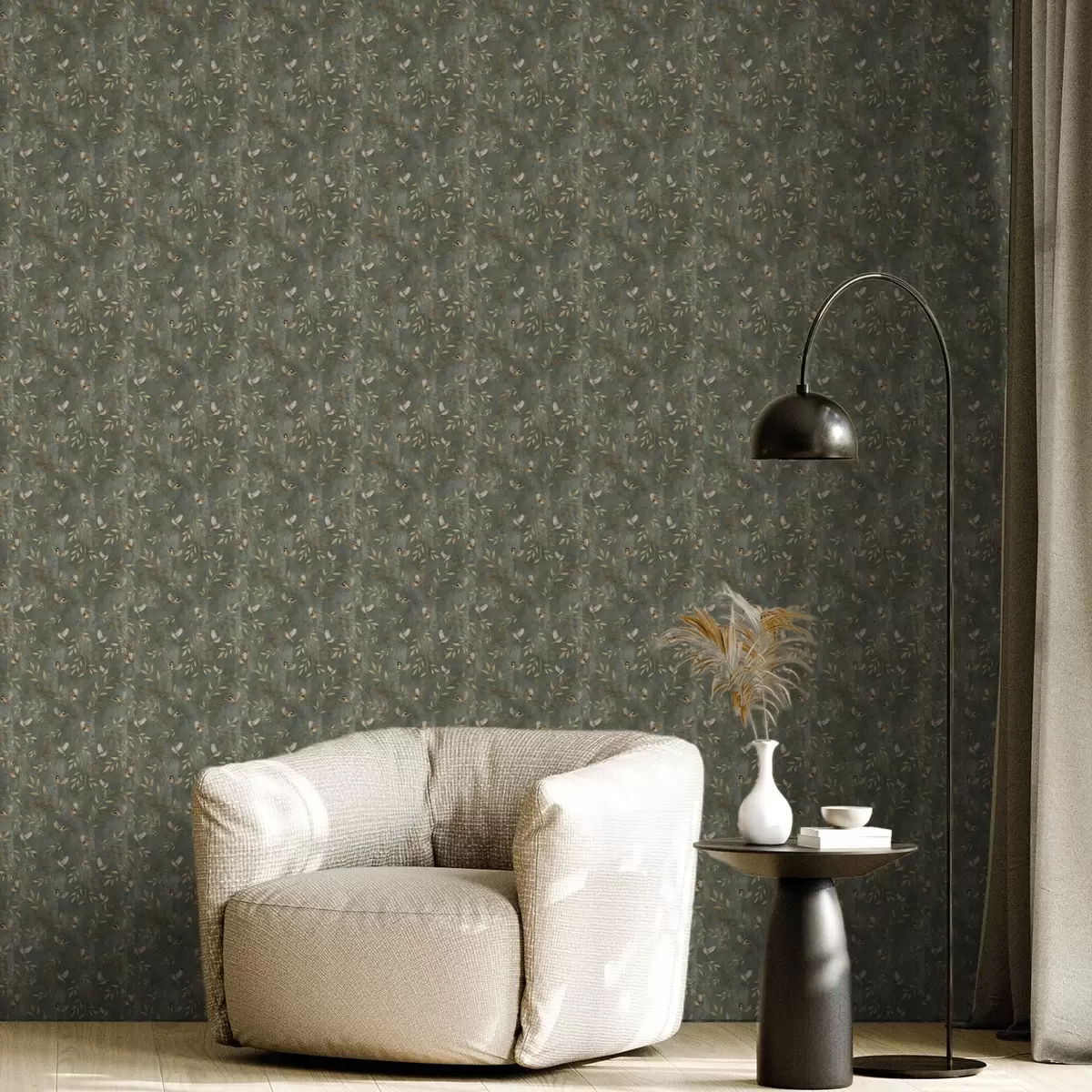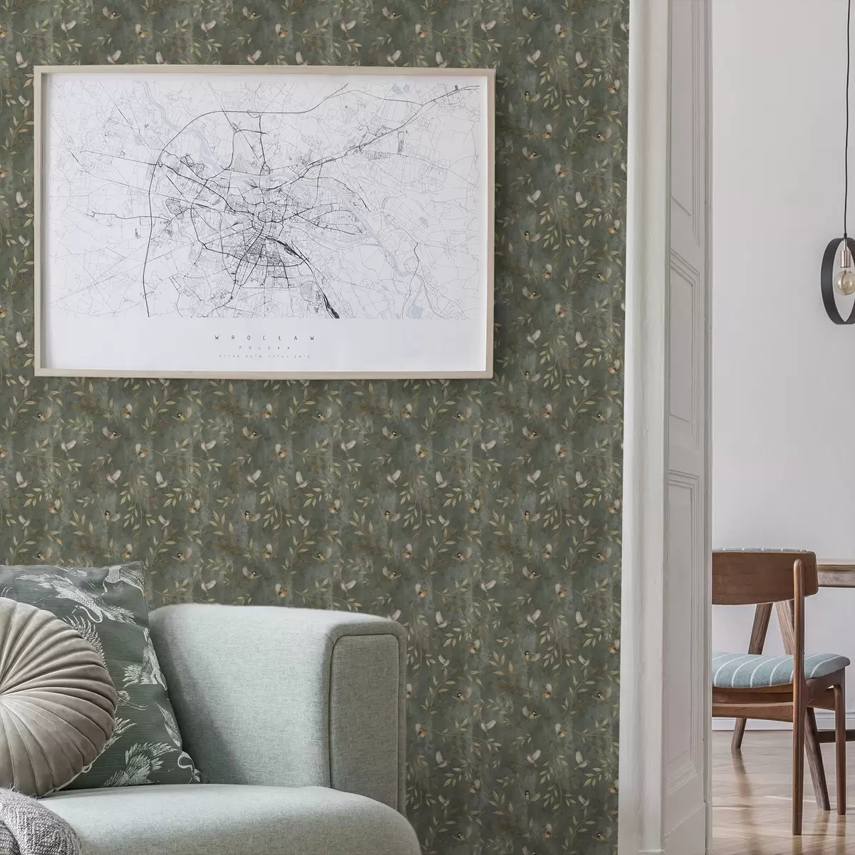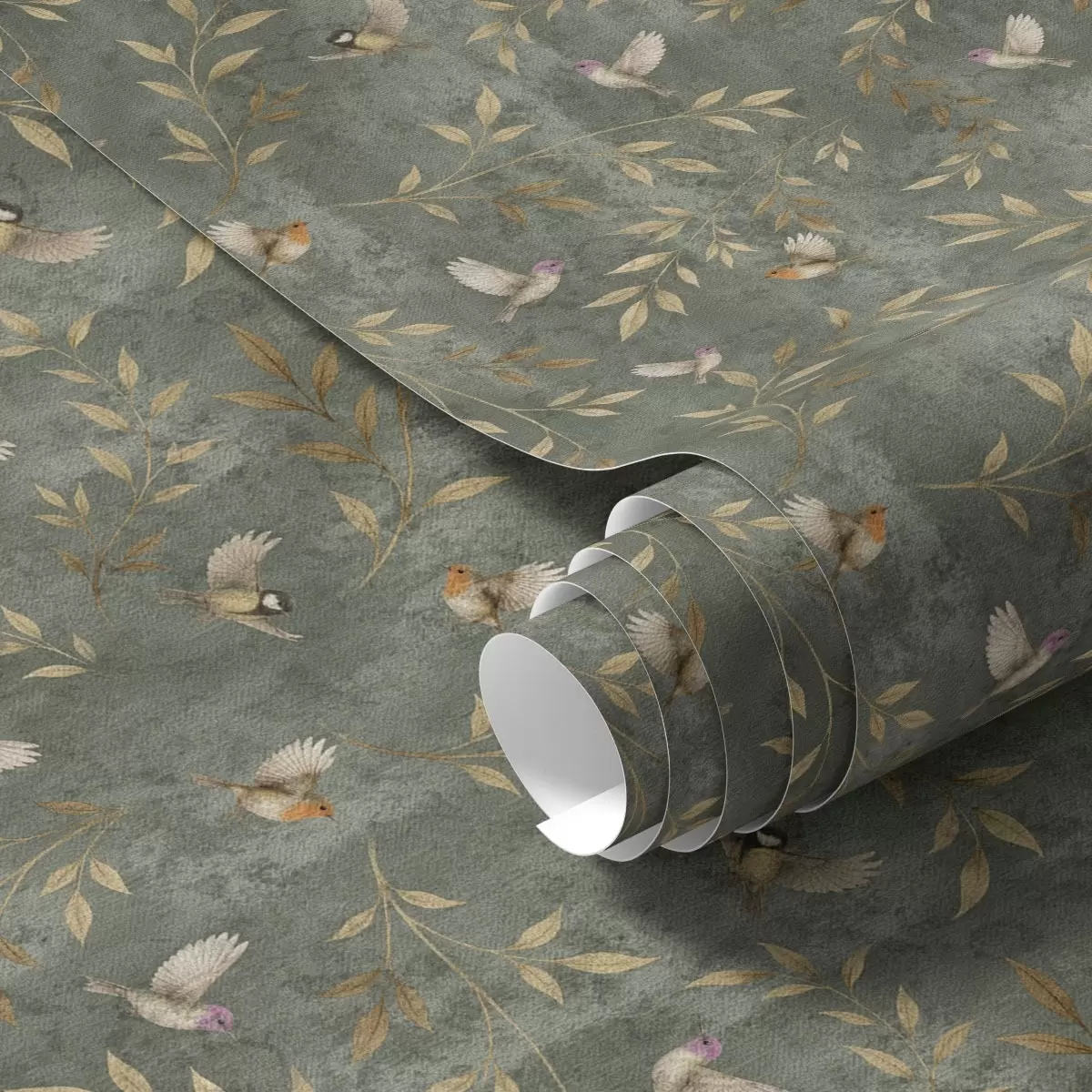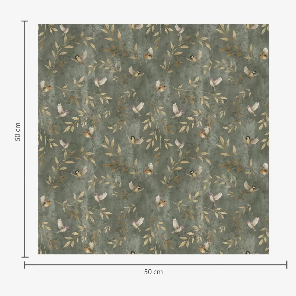 Tapet Fugler i oransje løvverk på en dypgrønn bakgrunn Nr. a00591