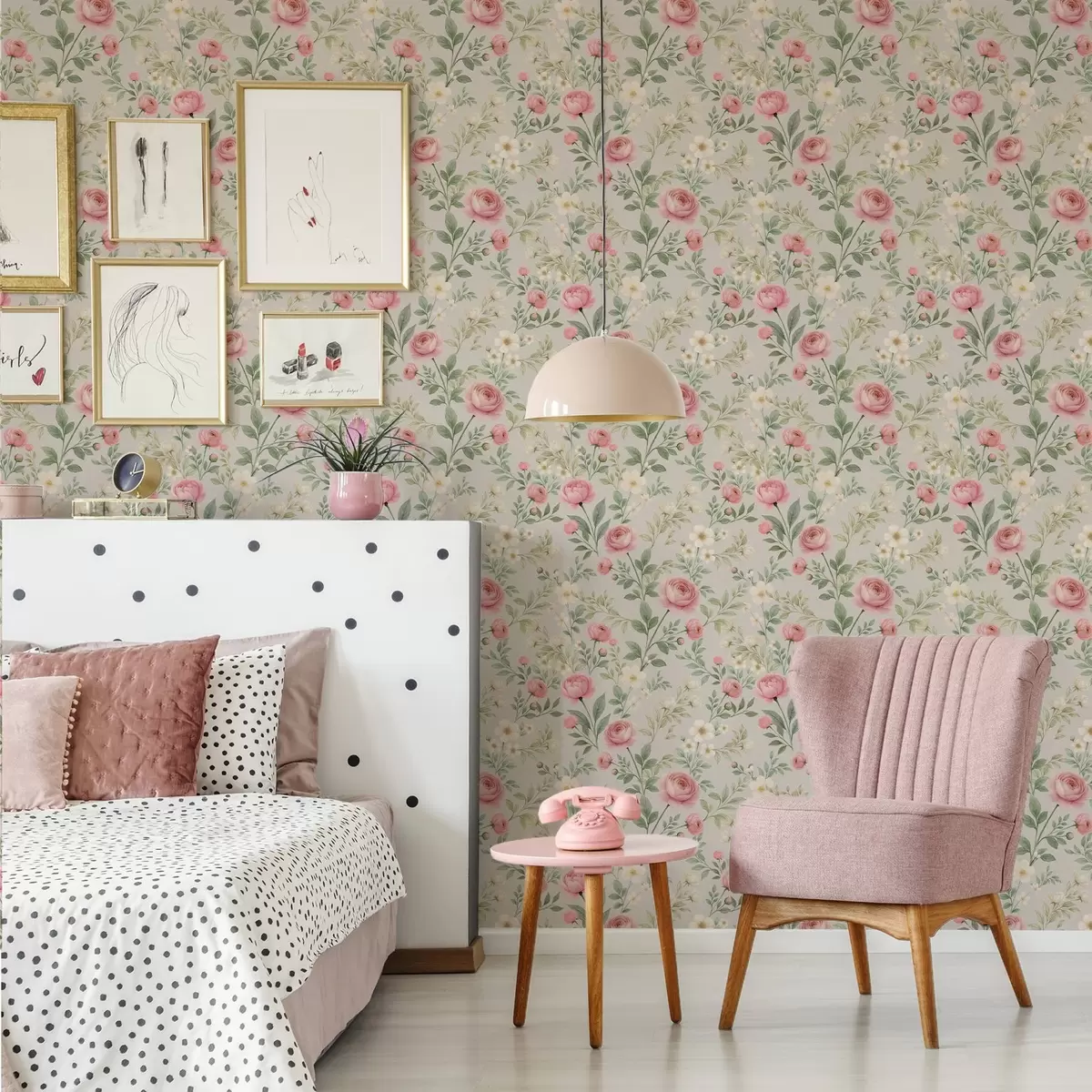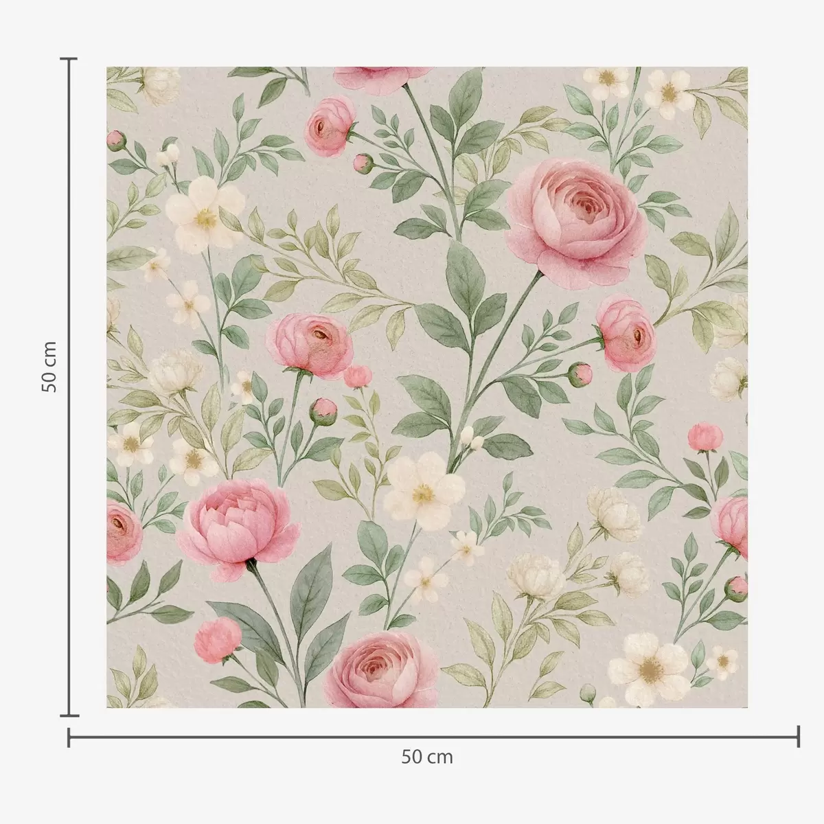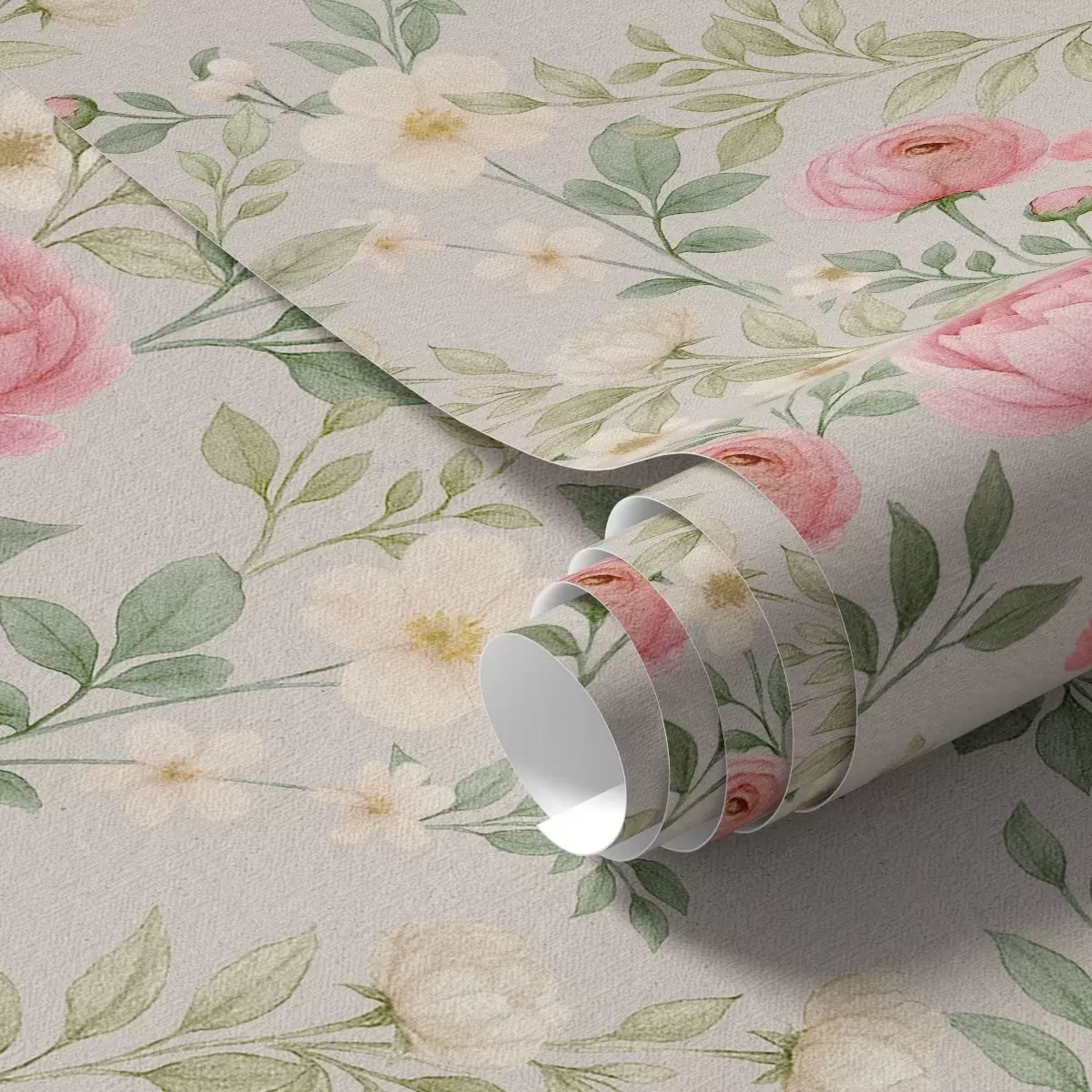Tapet Akvarellpioner og hvite blomster på gråbeige bakgrunn Nr. a00592