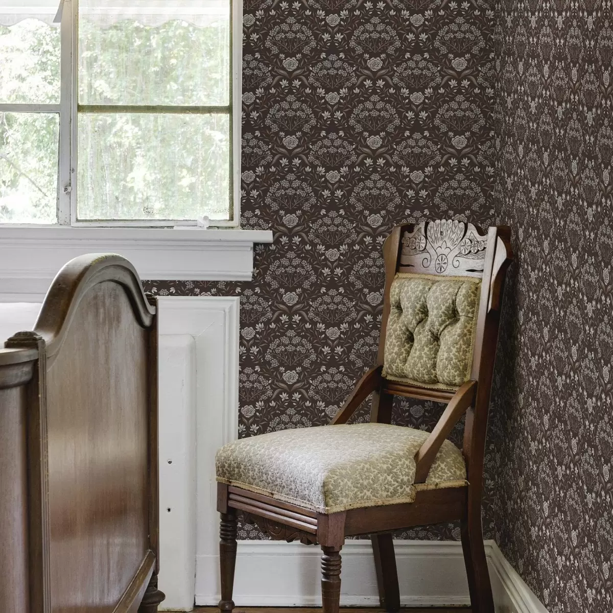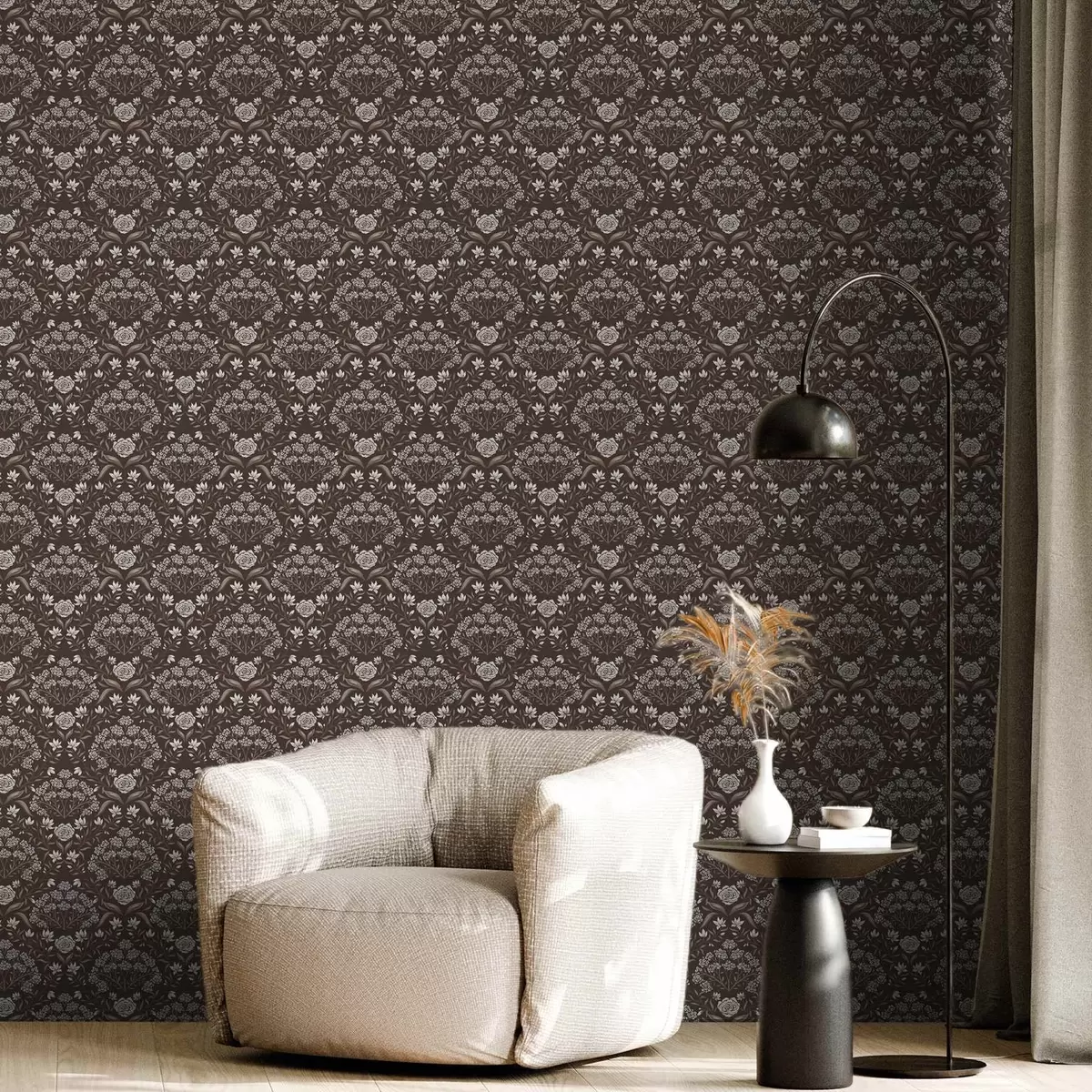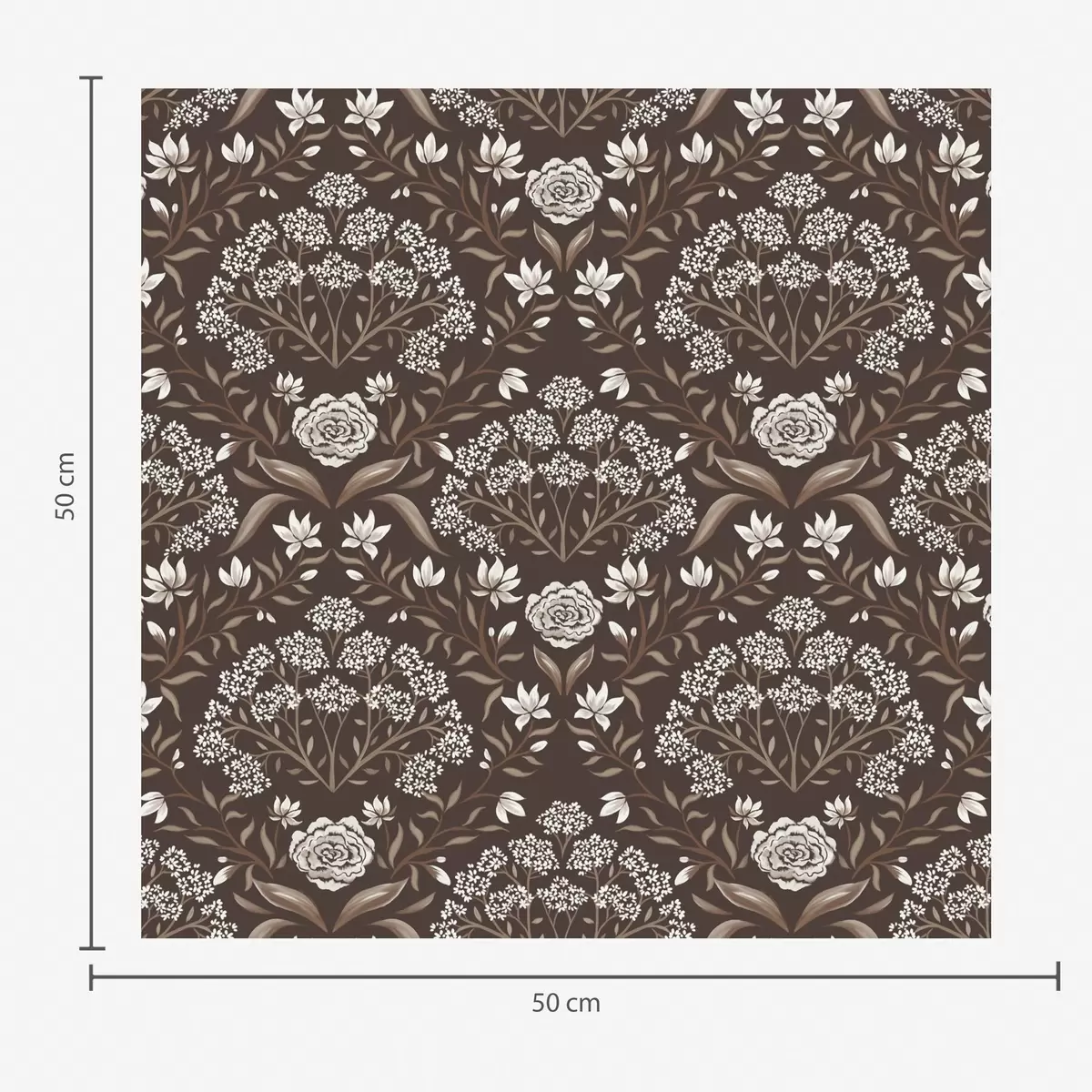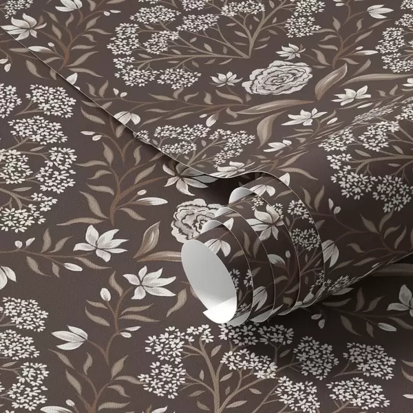 Tapet Mørk sjokolade-damask med pioner og snøklokker Nr. a00603v2