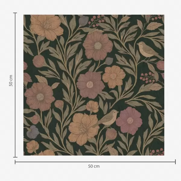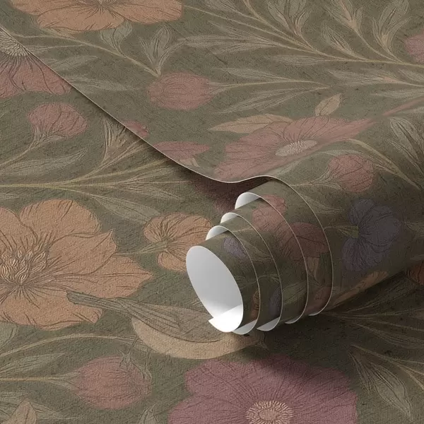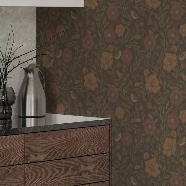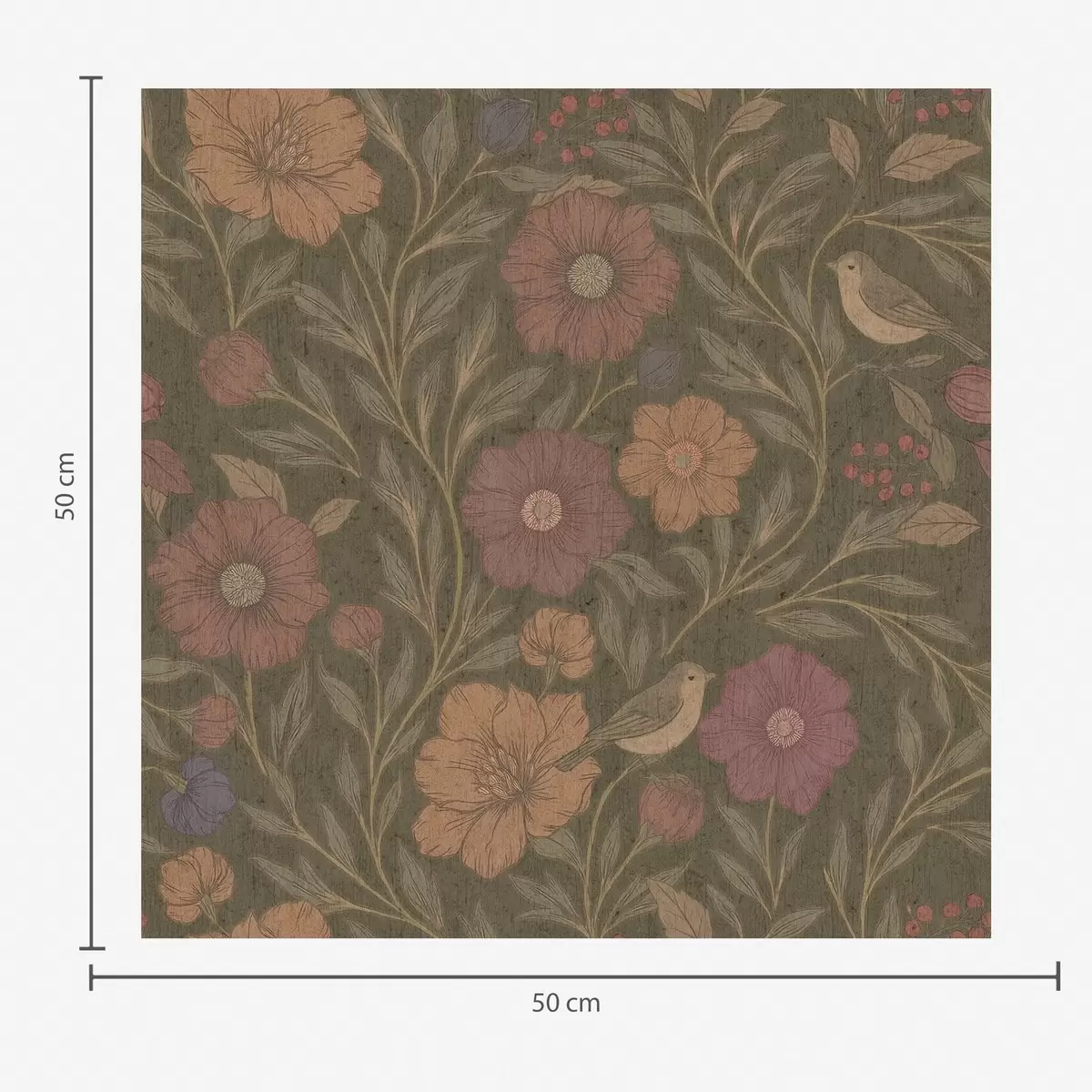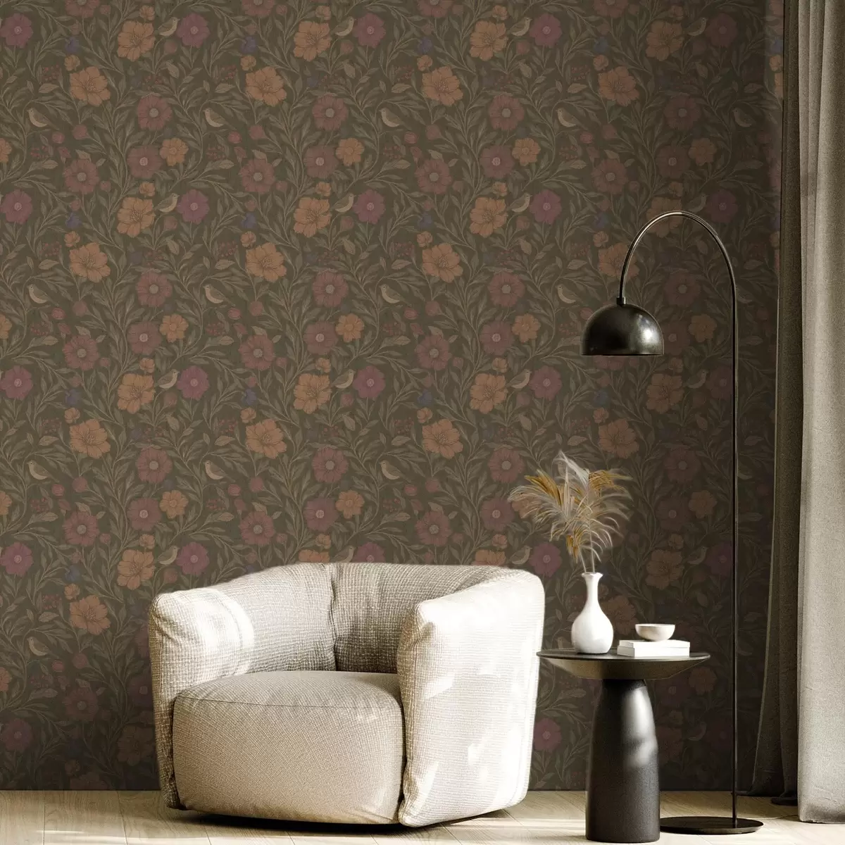 Tapet Høstblomster og fugler på olivenbrun bakgrunn Nr. a00605