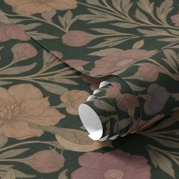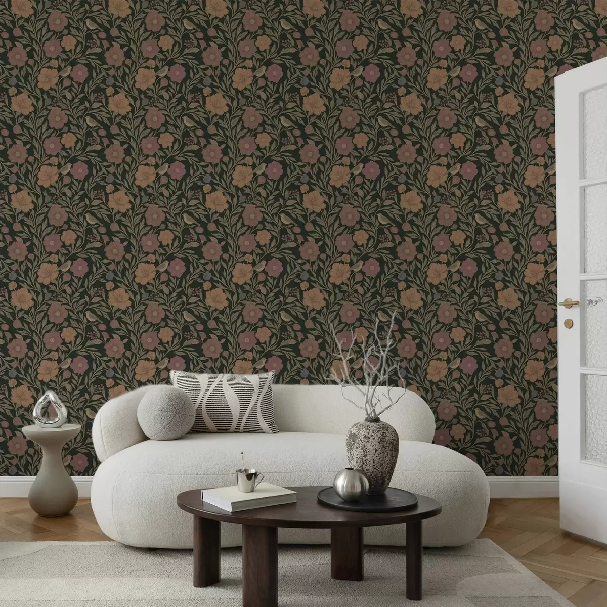 Tapet Høstblomster og fugler på dyp smaragdgrønn bakgrunn Nr. a00605v1
