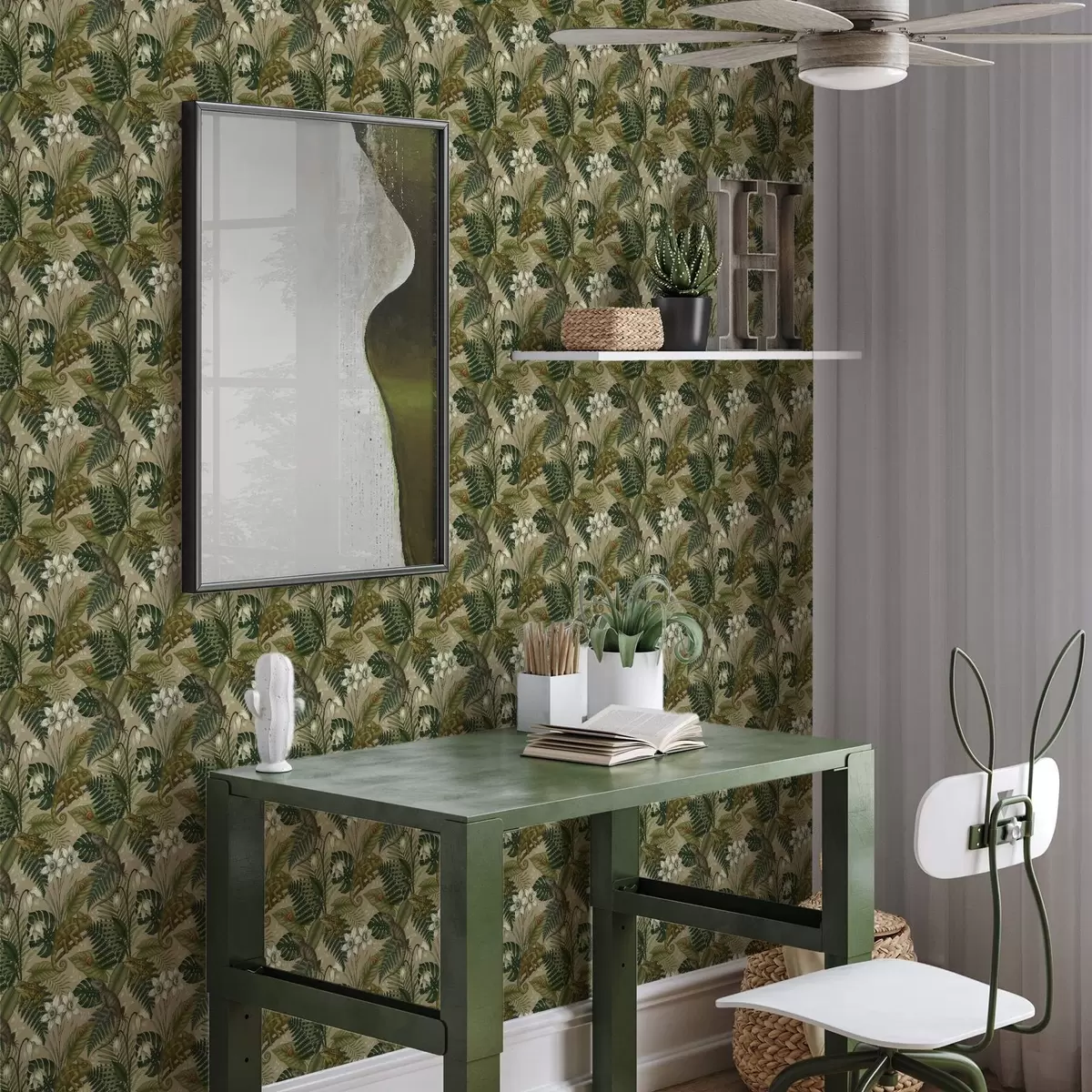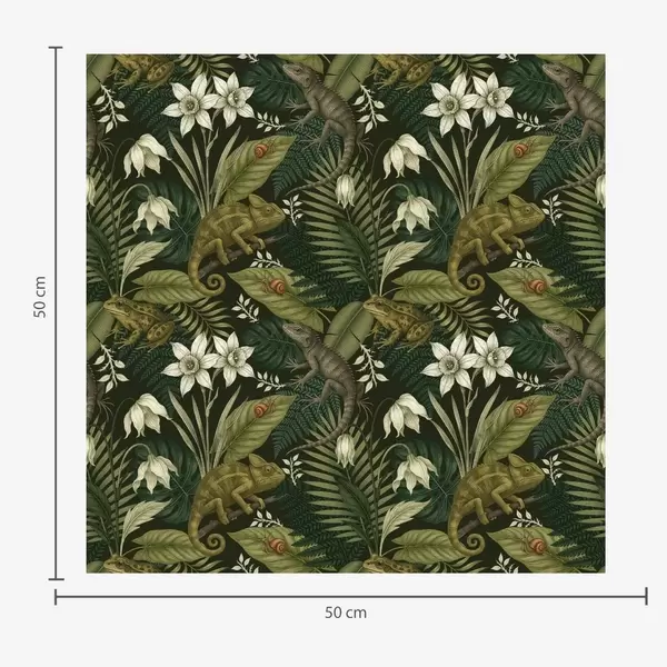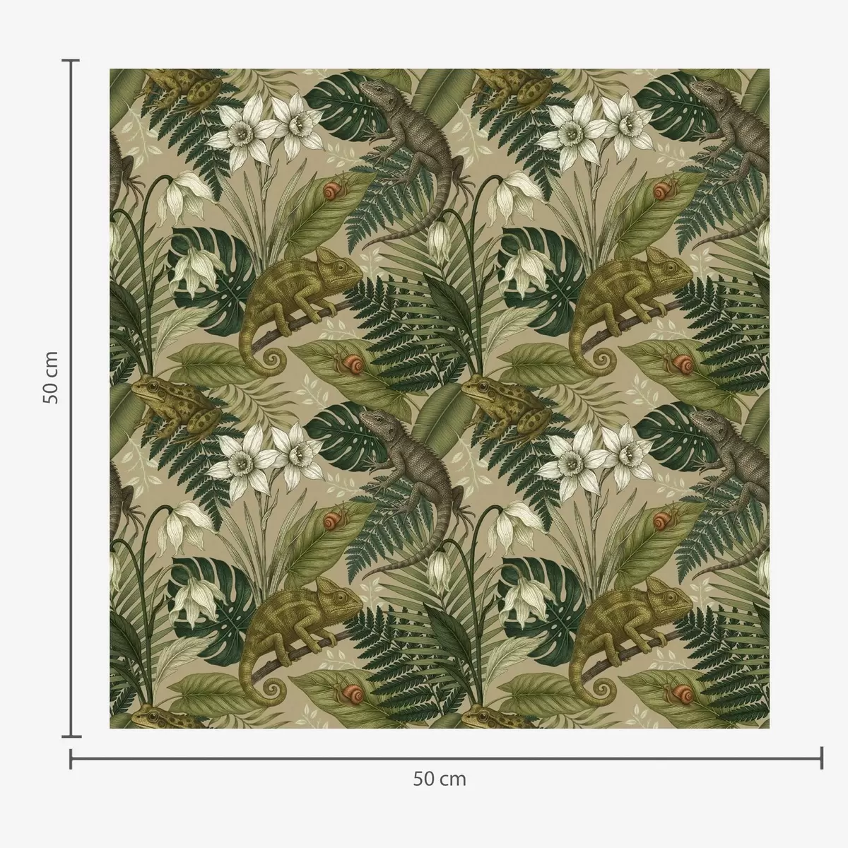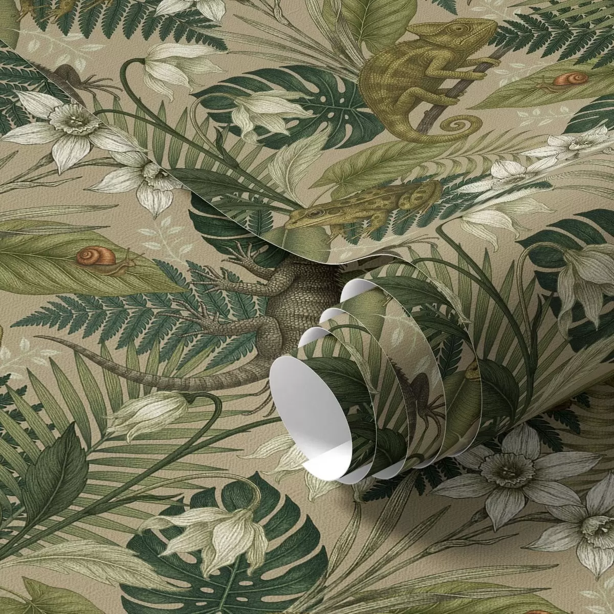 Tapet Kameleoner og tropiske blader, hvite blomster, beige bakgrunn Nr. a00608
