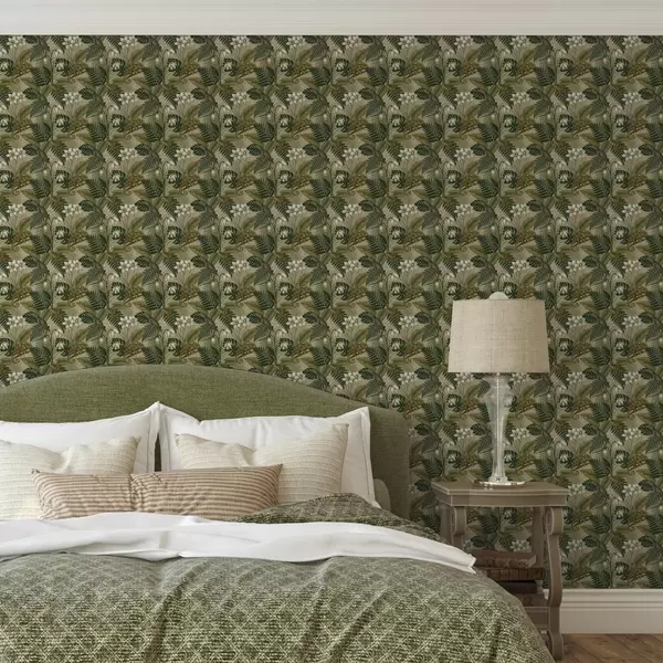Tapet Kameleoner og tropiske blader, hvite blomster, beige bakgrunn Nr. a00608