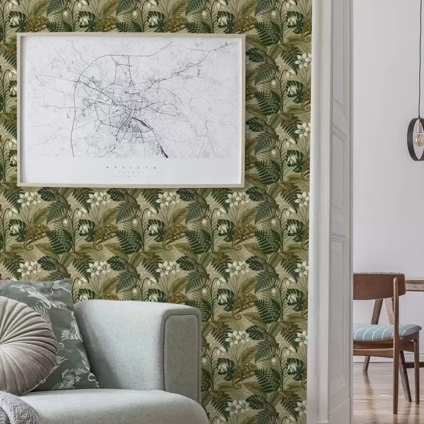 Tapet Kameleoner og tropiske blader, hvite blomster, beige bakgrunn Nr. a00608