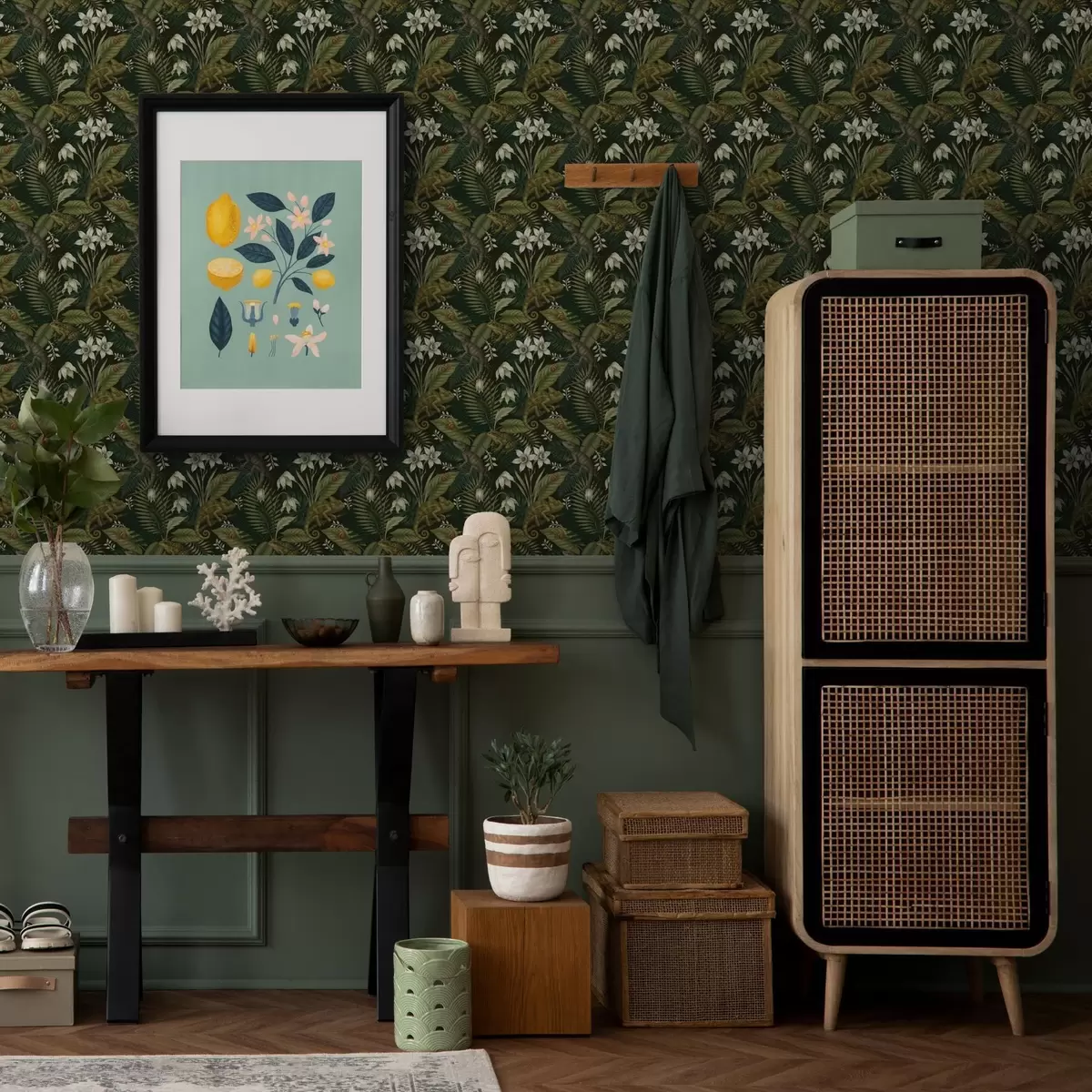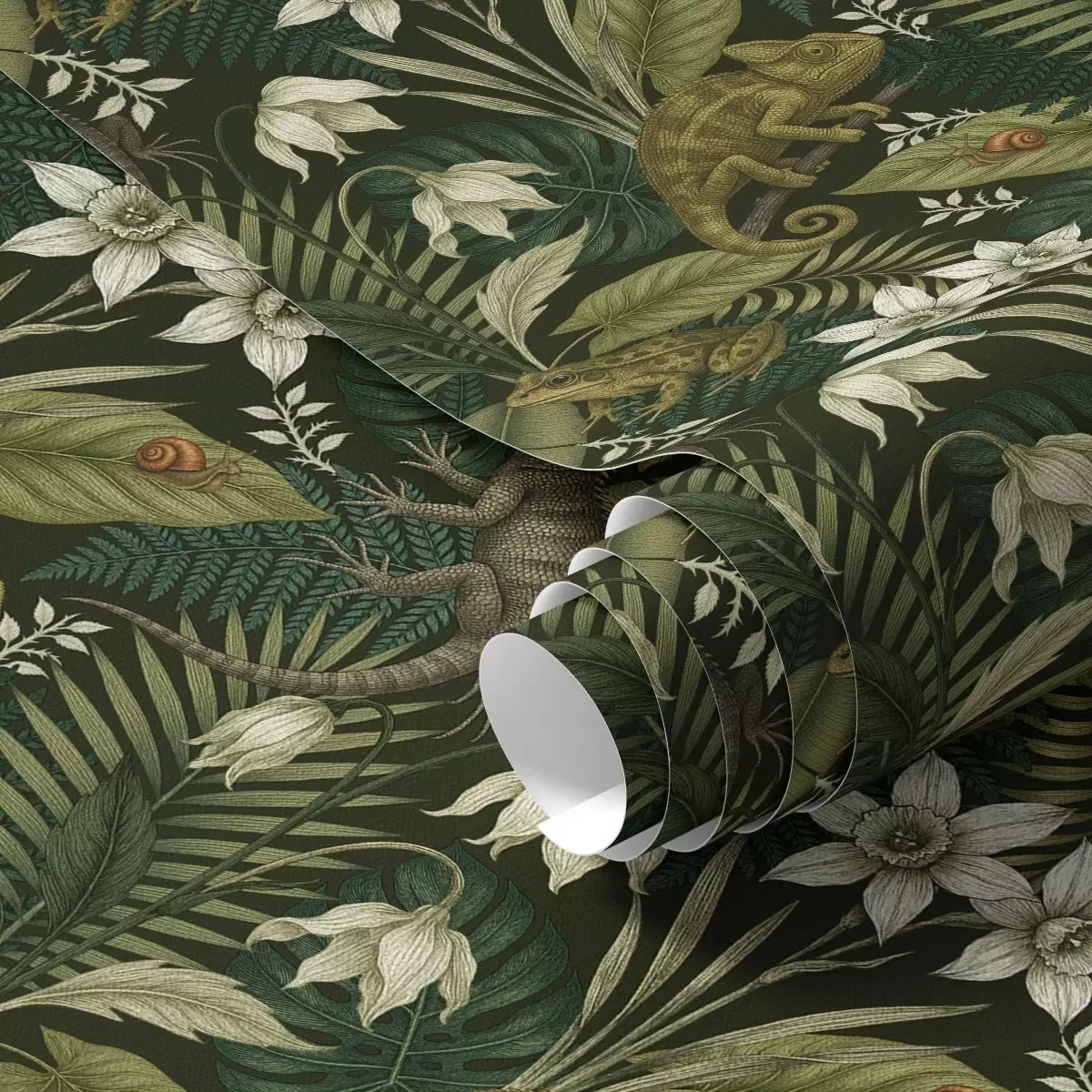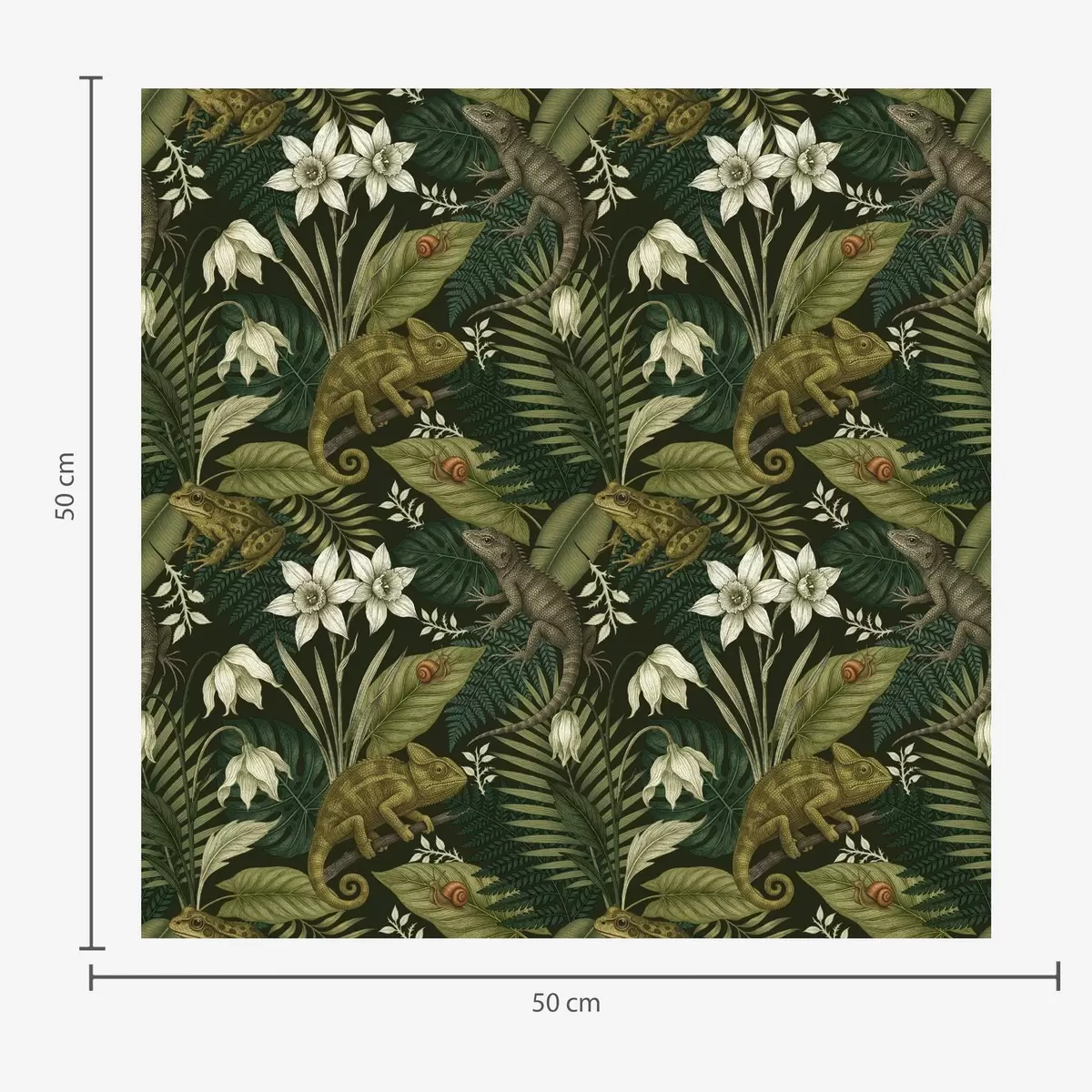 Tapet Kameleoner og tropiske blader, hvite blomster, mørk bakgrunn Nr. a00608v1