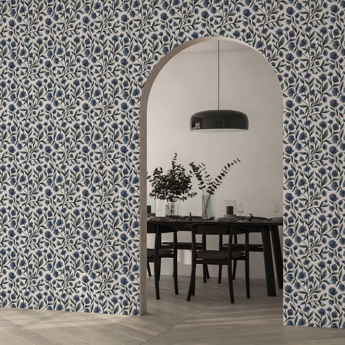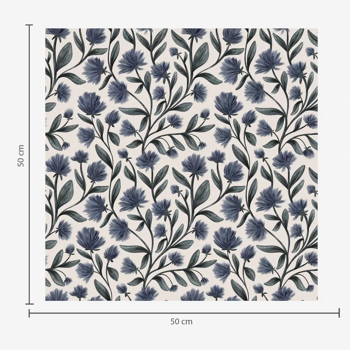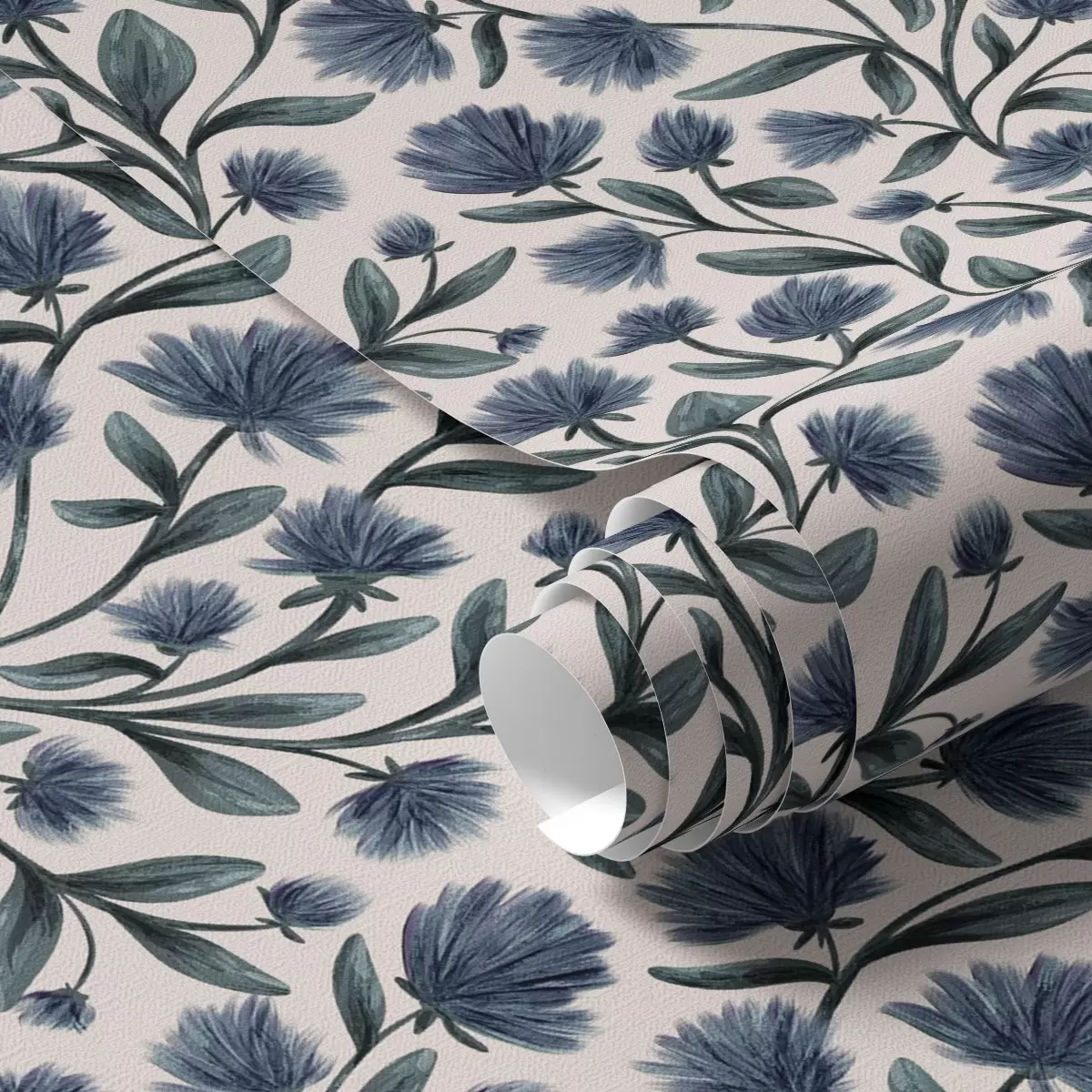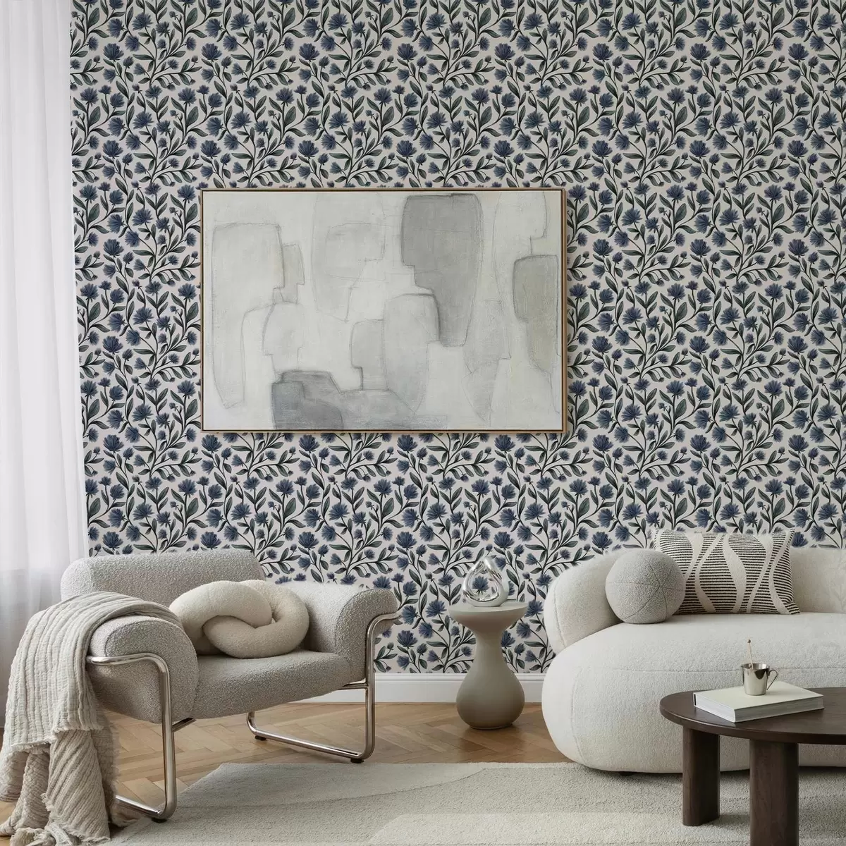 Tapet Villblomster i blågrønne farger på kremfarget bakgrunn Nr. a00623v2
