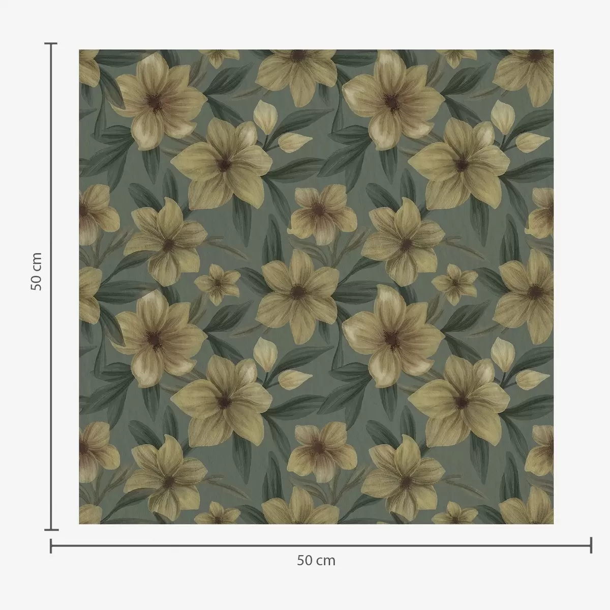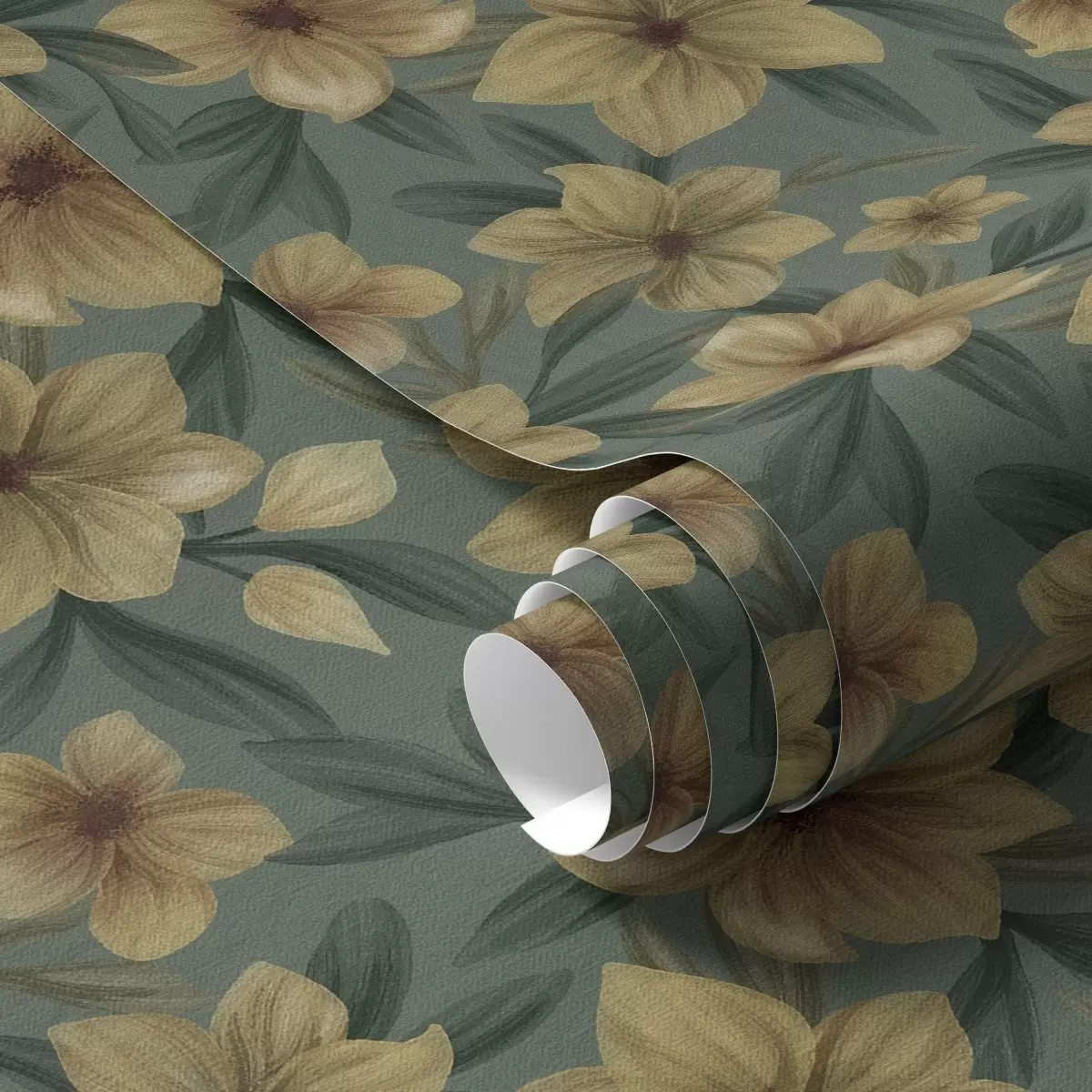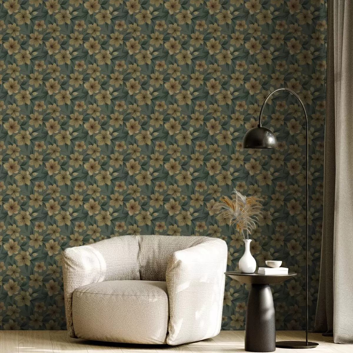 Tapet Okerfargede blomster på en dypgrønn bakgrunn, tett mønster Nr. a00628