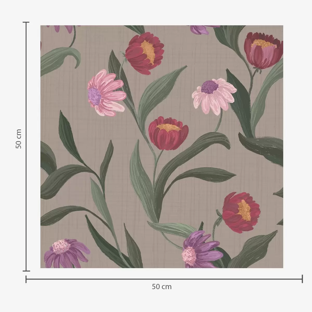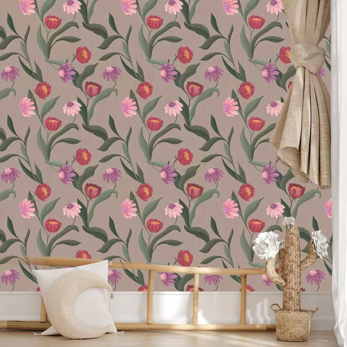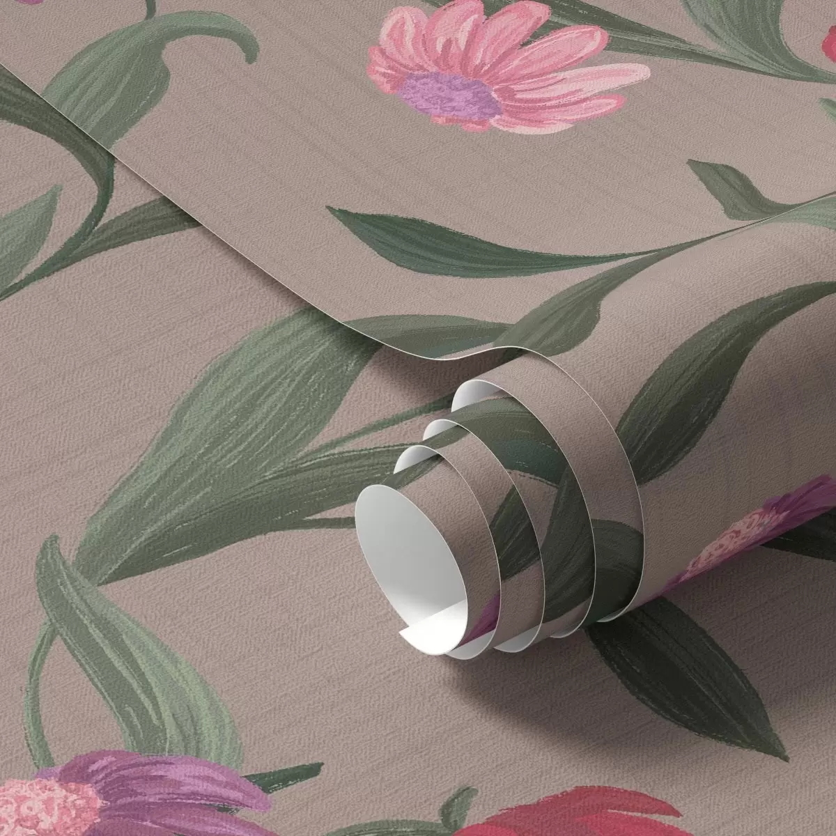 Tapet Rosa-røde blomster på en taupefarget bakgrunn, lange stilker Nr. a00631v2