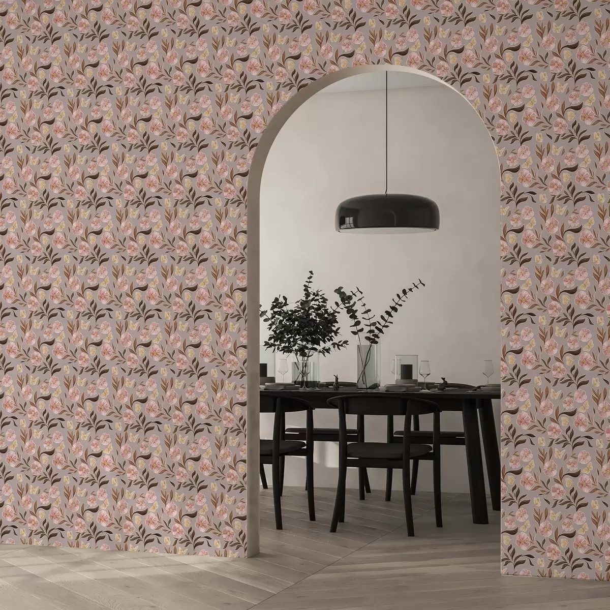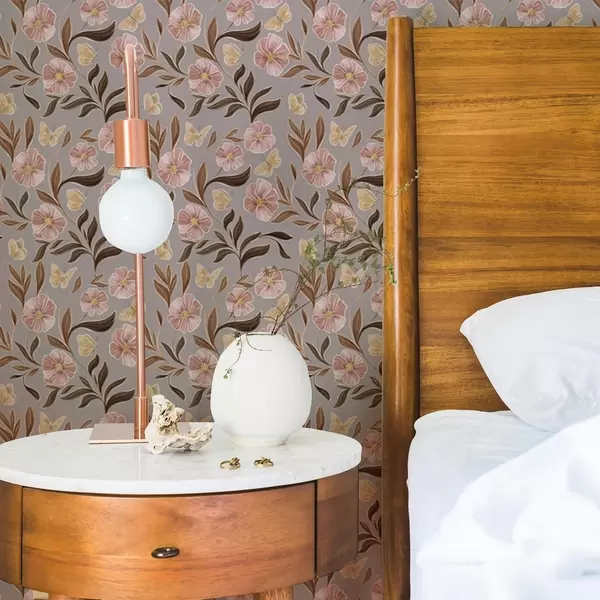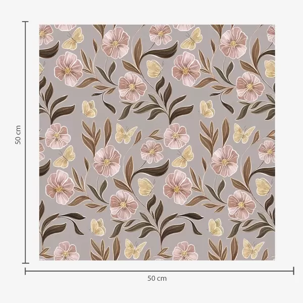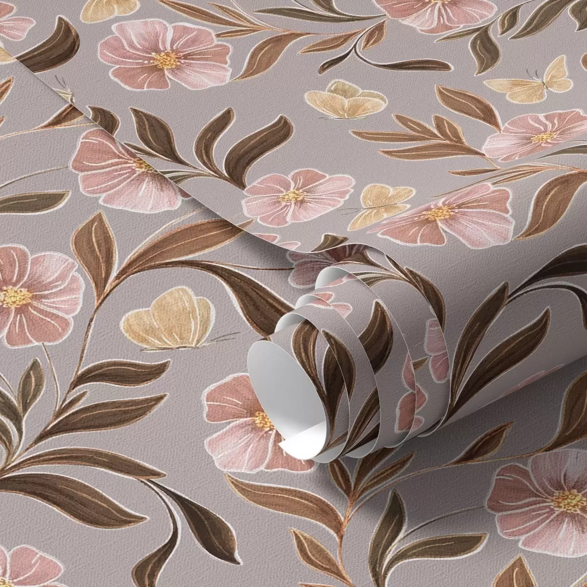 Tapet Rosa blomster og sommerfugler på en gråbeige bakgrunn Nr. a00633