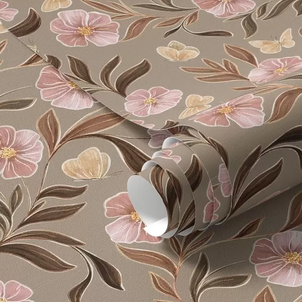 Tapet Rosa blomster og sommerfugler på en olivenbeige bakgrunn Nr. a00633v2
