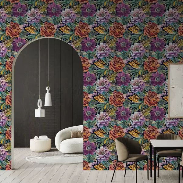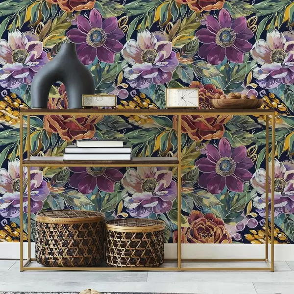 Tapet Fete, store blomster malt med pensel på mørkeblå bakgrunn Nr. a00643