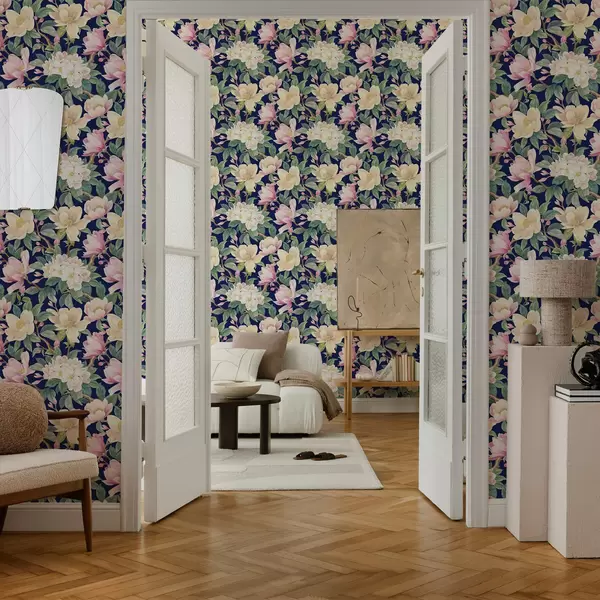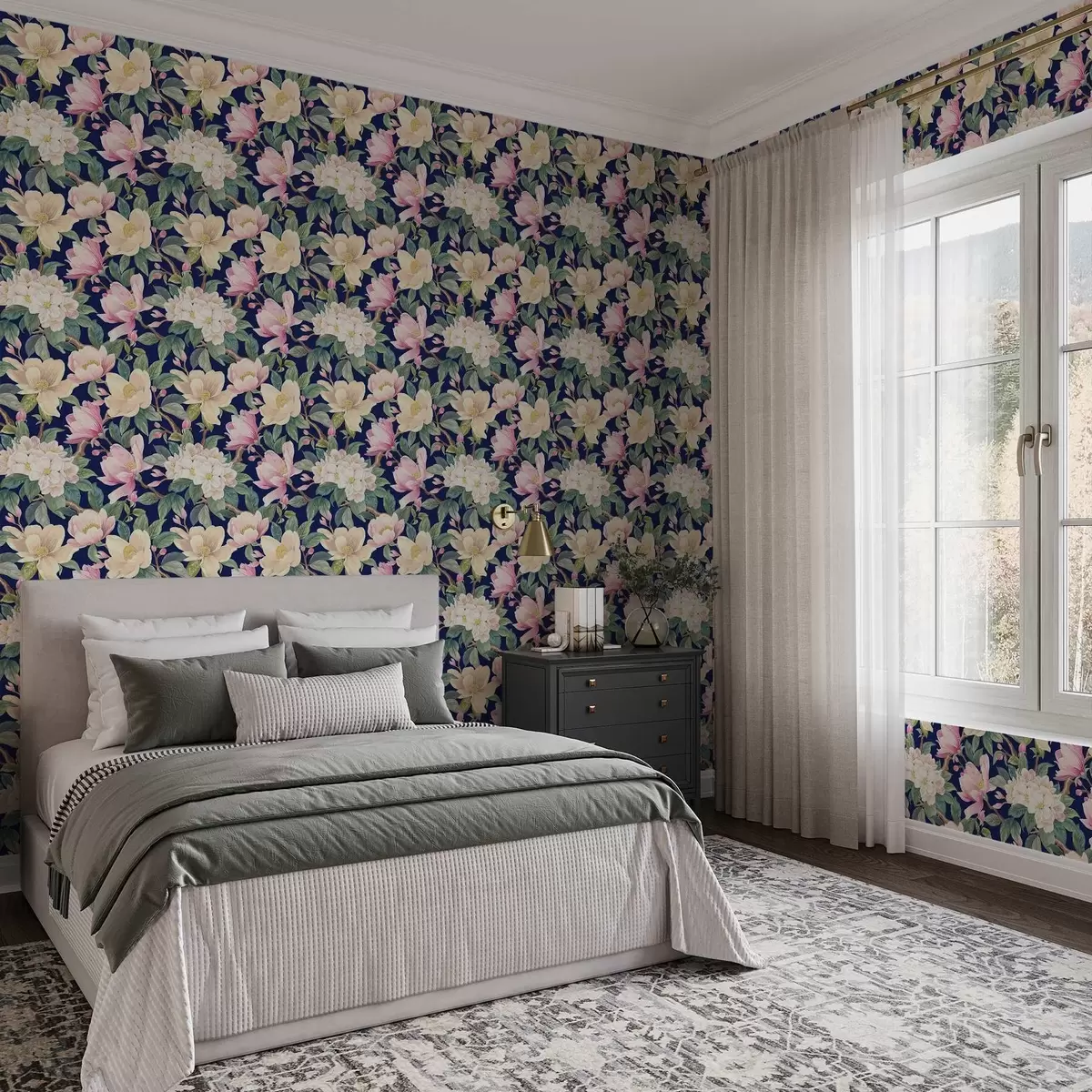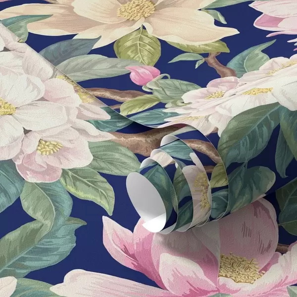 Tapet Magnoliaer og knopper på en mørk marineblå bakgrunn Nr. a00644v1