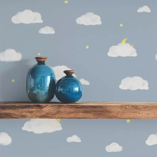 Tapet Myke skyer, stjerner og sol på blå bakgrunn Nr. a00652