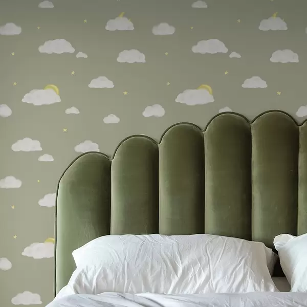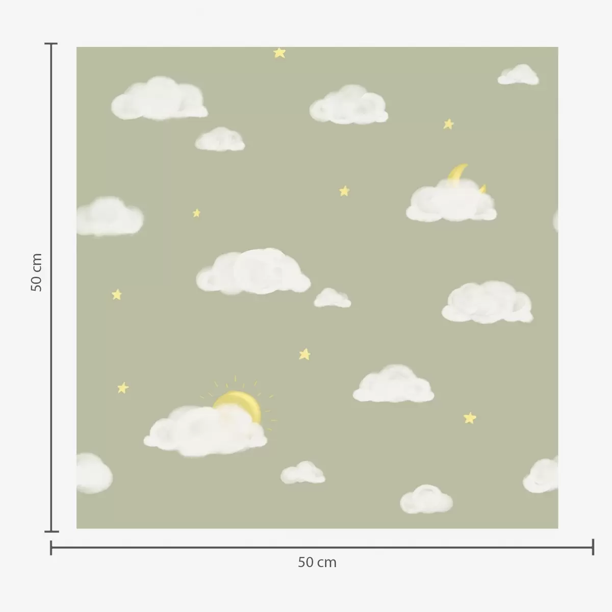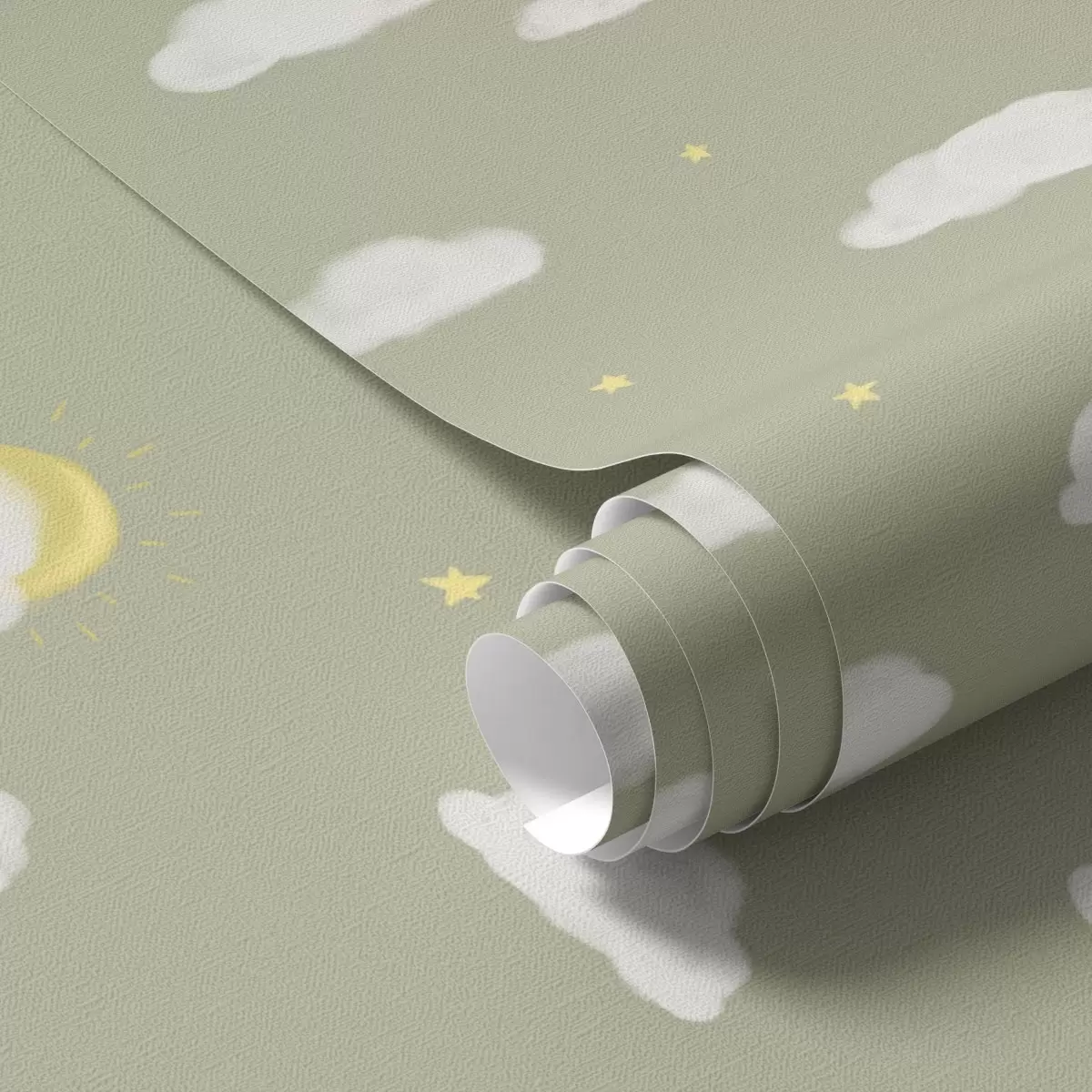 Tapet Myke skyer, stjerner og sol på en grønngrå bakgrunn Nr. a00652v1