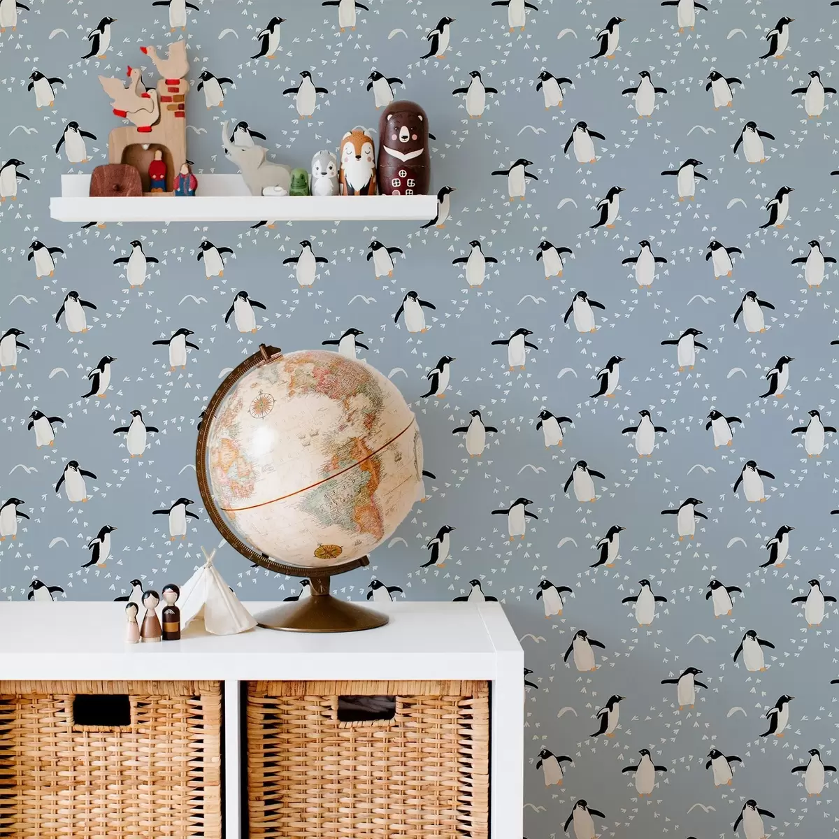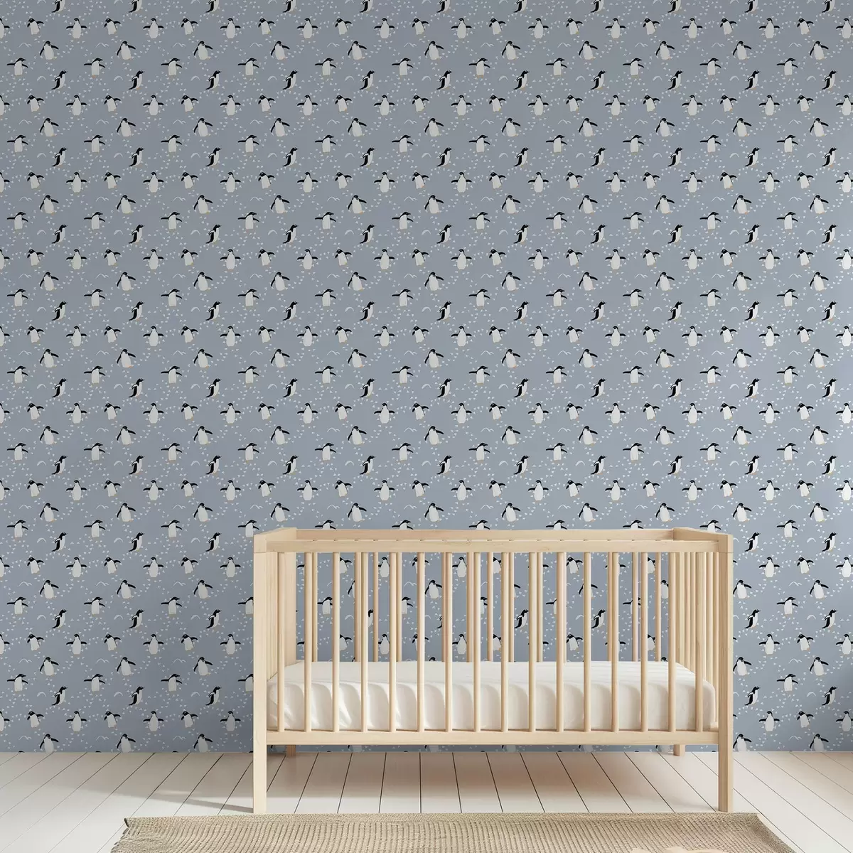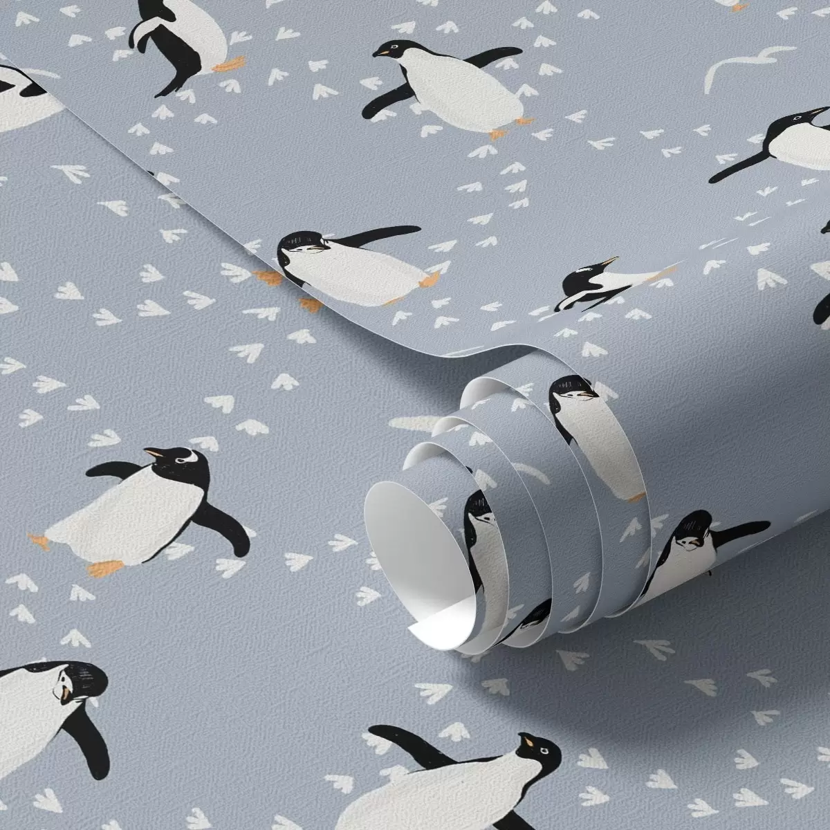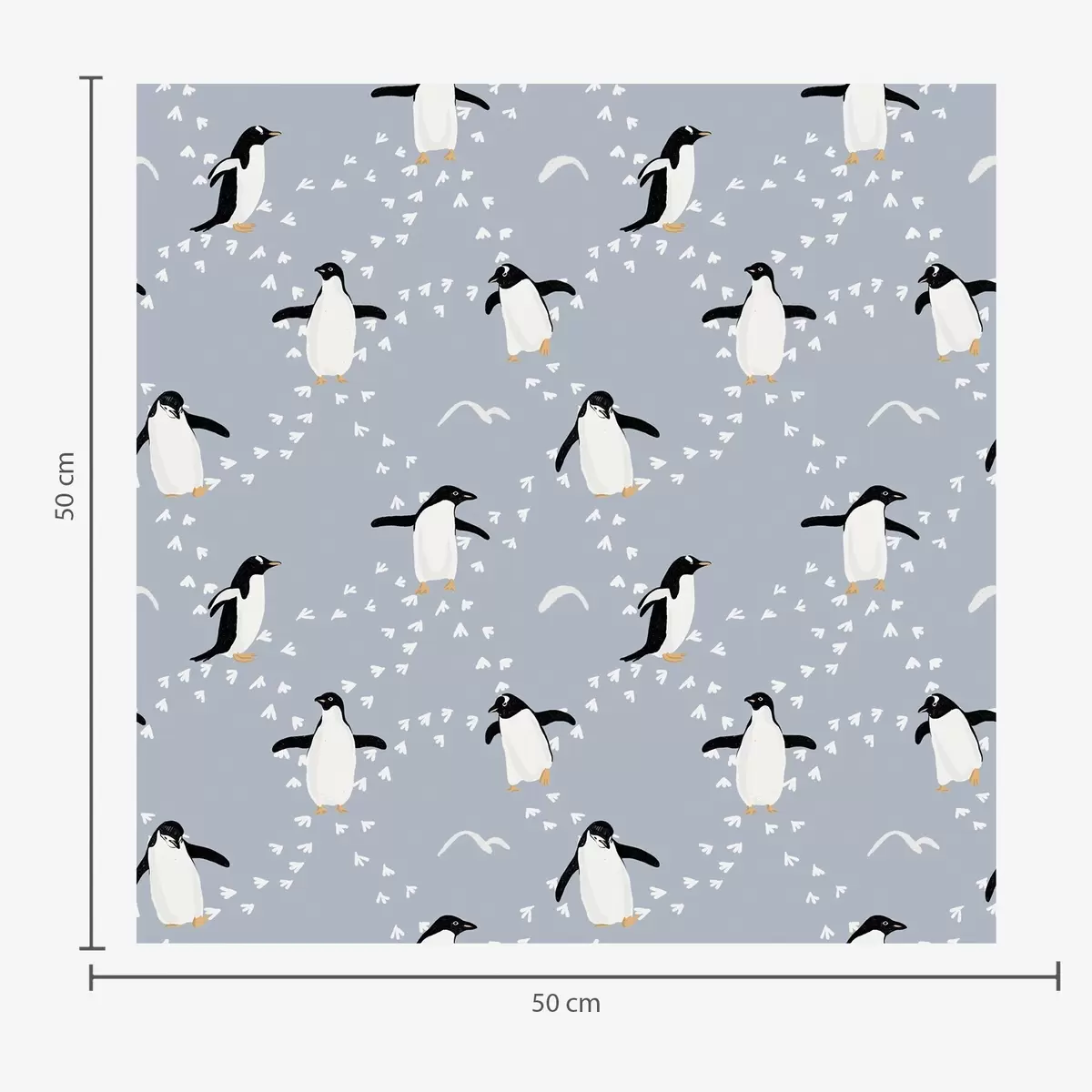 Tapet Pingviner på gråblå bakgrunn med fotavtrykk Nr. a00655