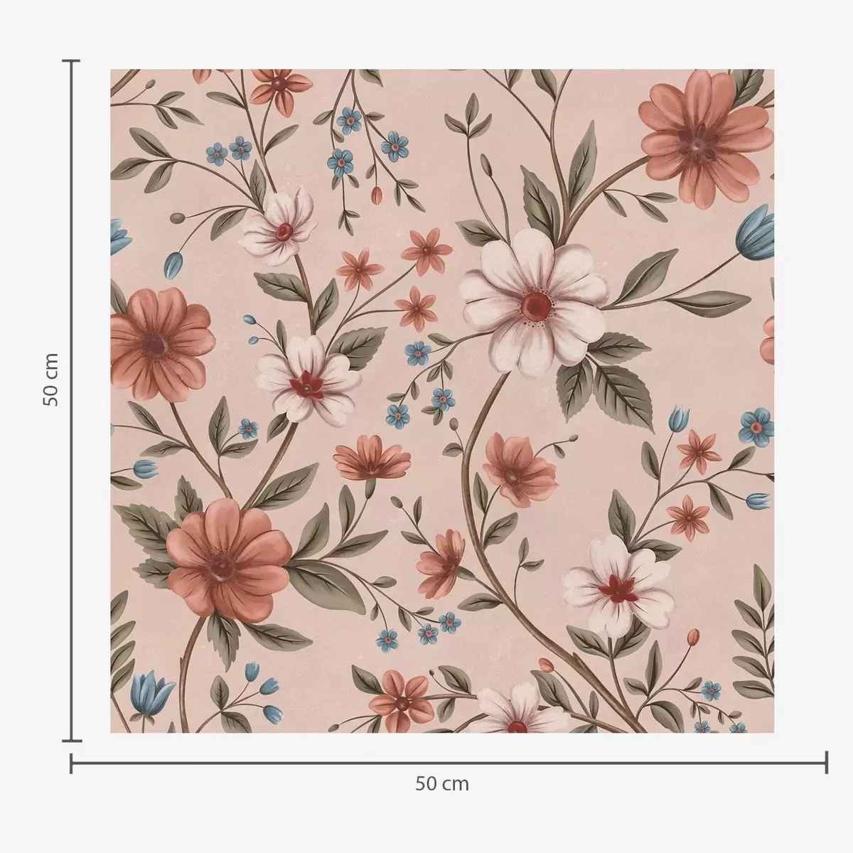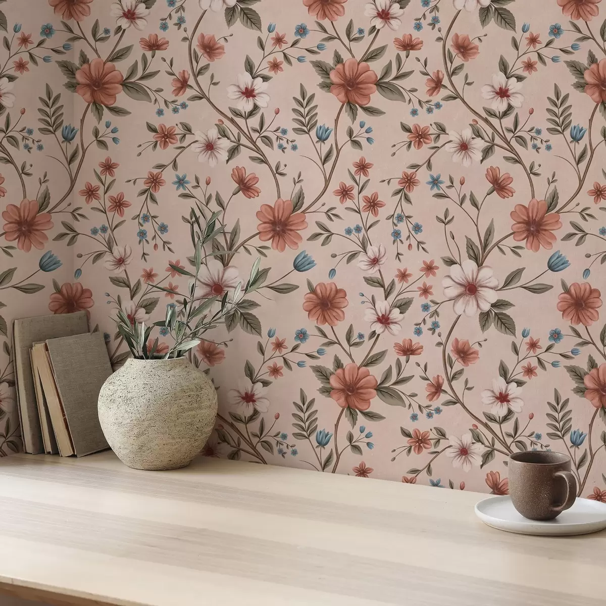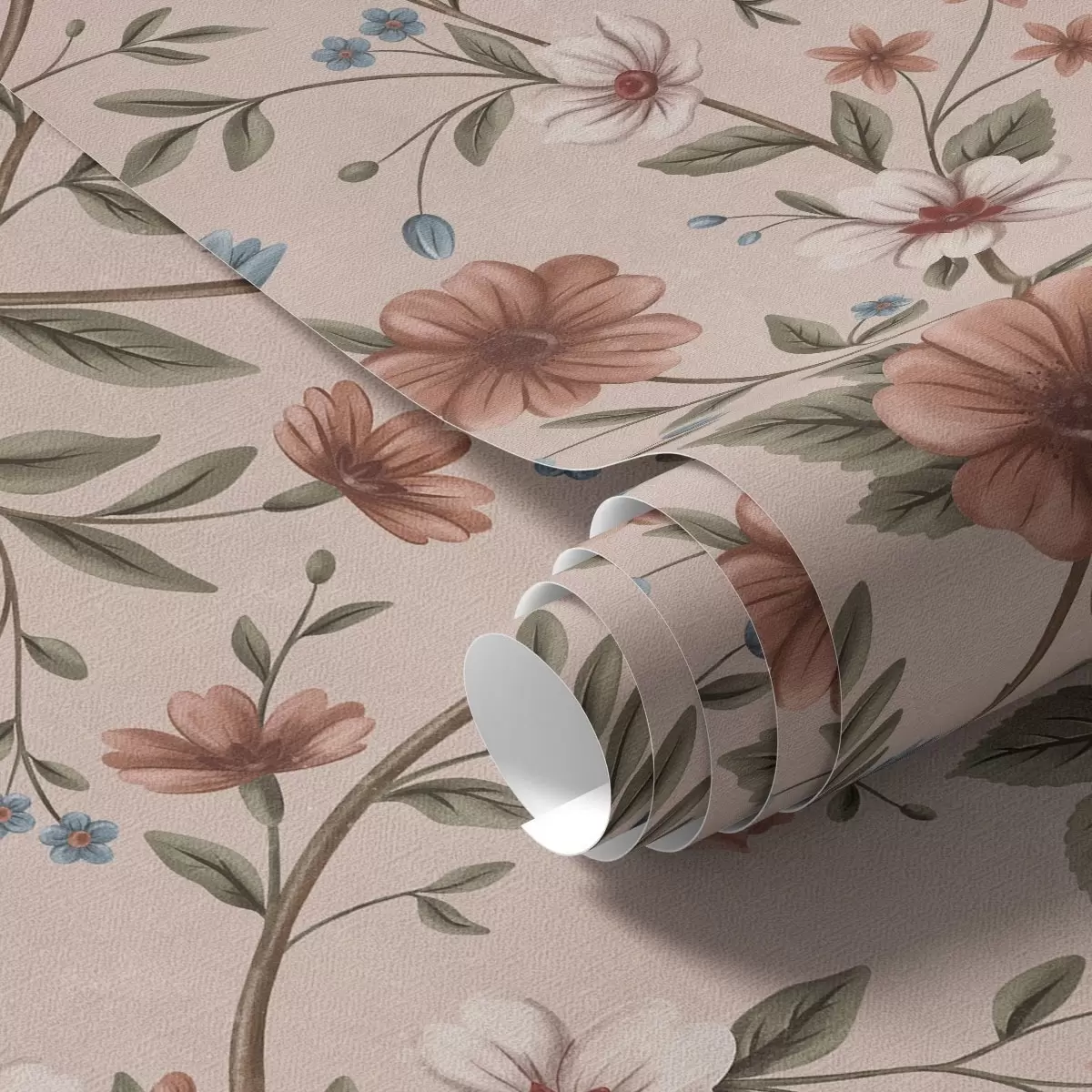 Tapet Rosa korallblomster og løvverk på støvrosa bakgrunn Nr. a00667