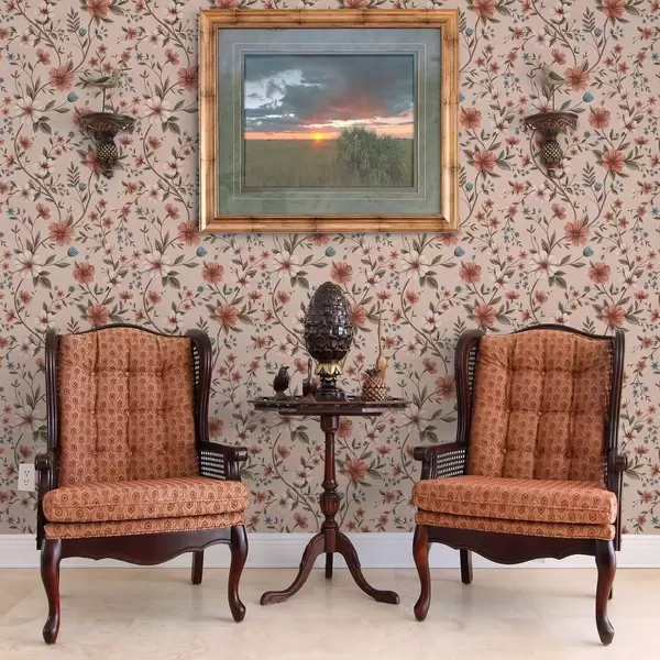 Tapet Rosa korallblomster og løvverk på støvrosa bakgrunn Nr. a00667