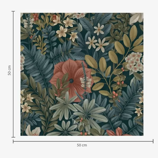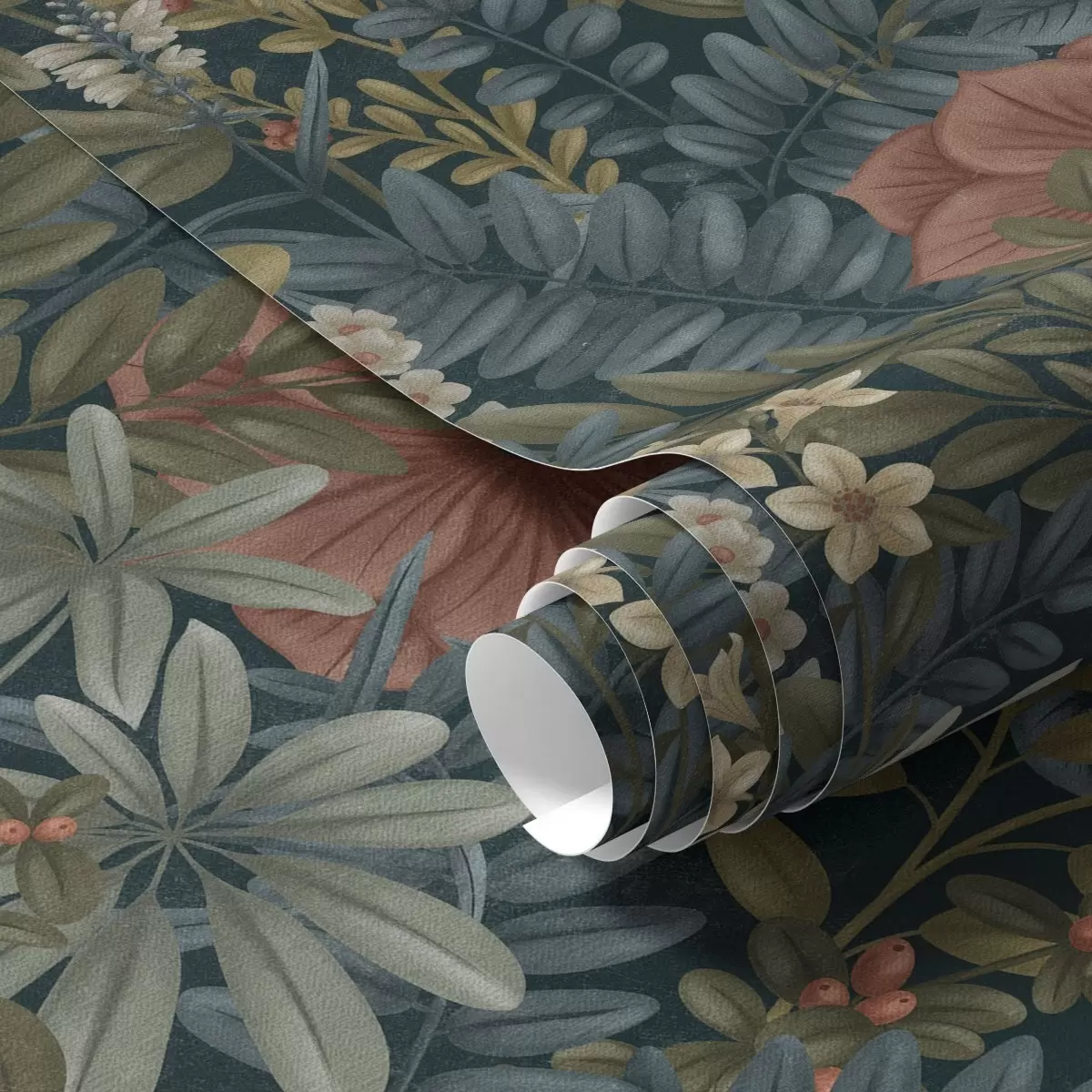 Tapet Mørk bakgrunn med tette blomster og blader i varme farger Nr. a00678