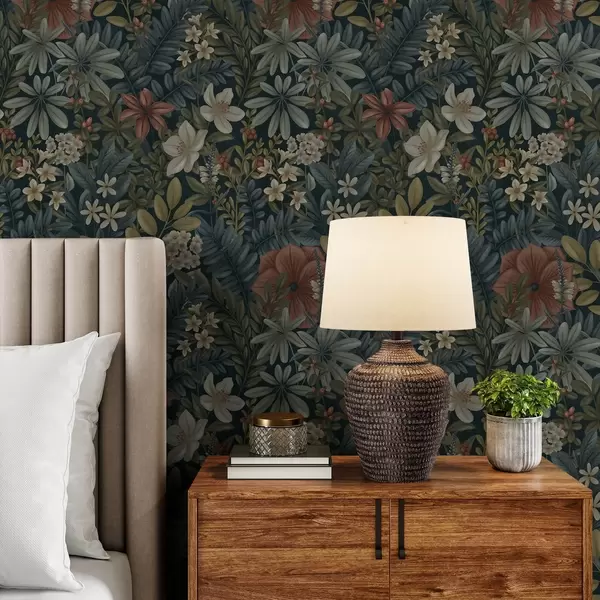 Tapet Mørk bakgrunn med tette blomster og blader i varme farger Nr. a00678