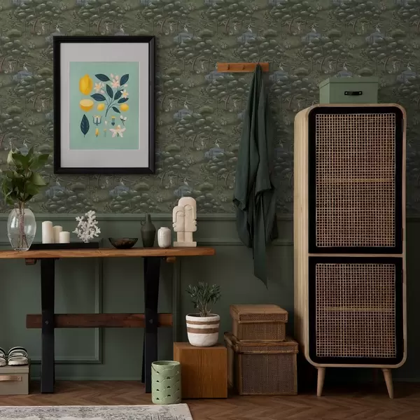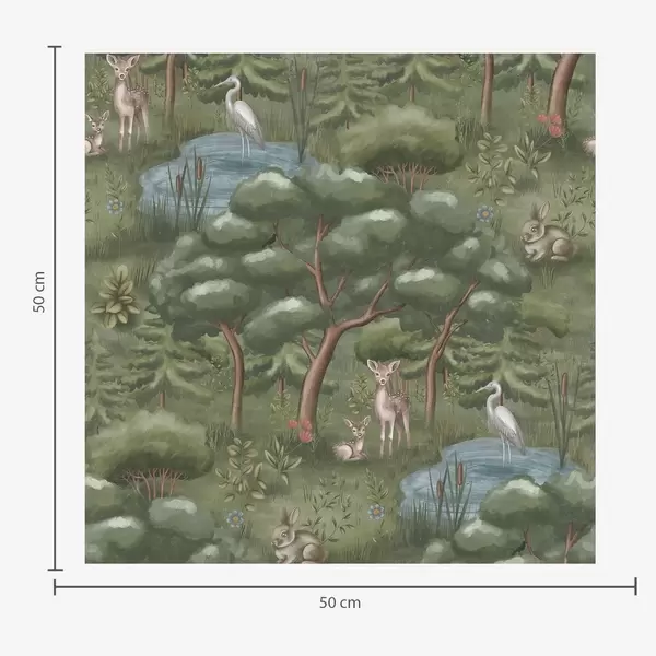 Tapet Skogslysning med rådyr, kaniner og hegrer Nr. a00680