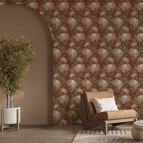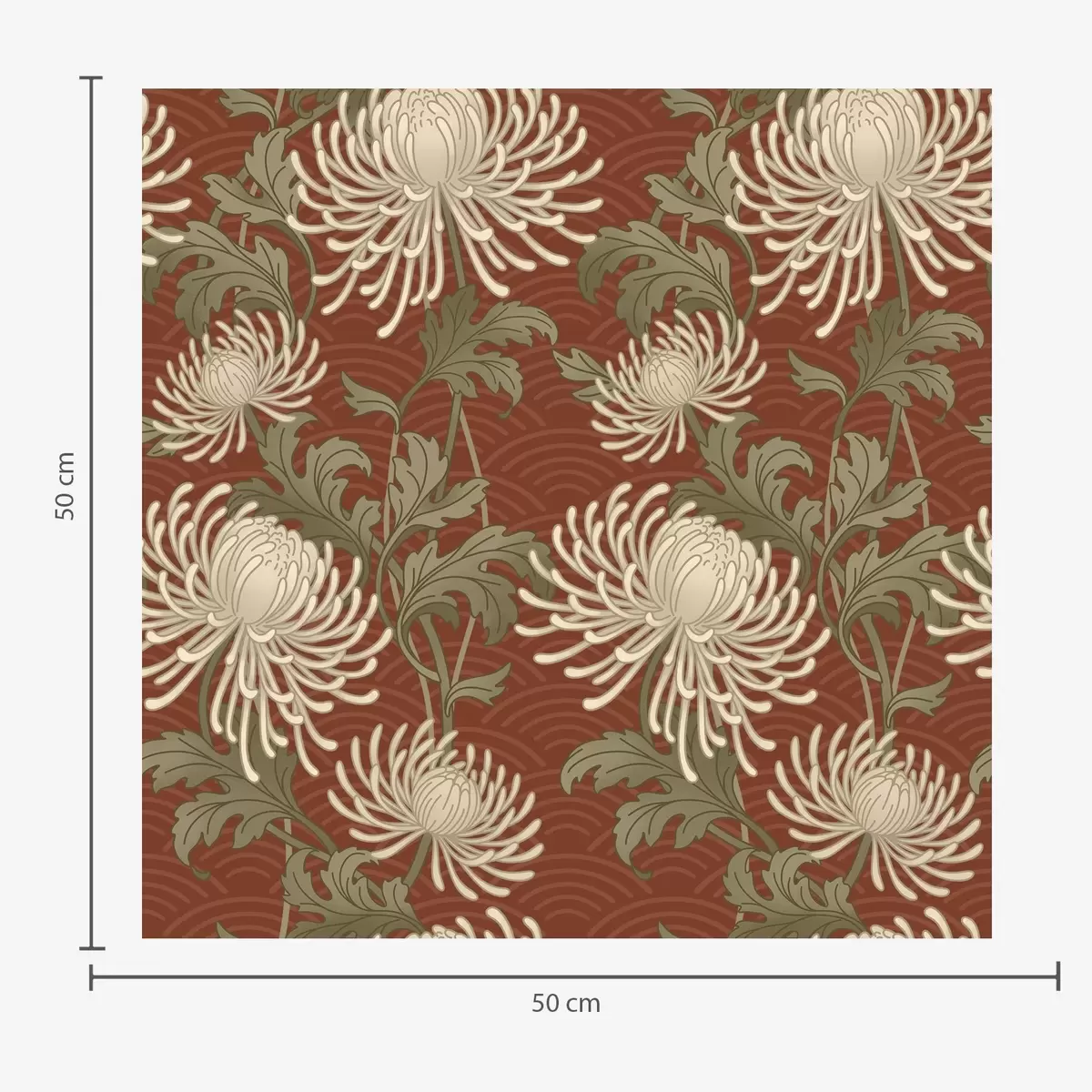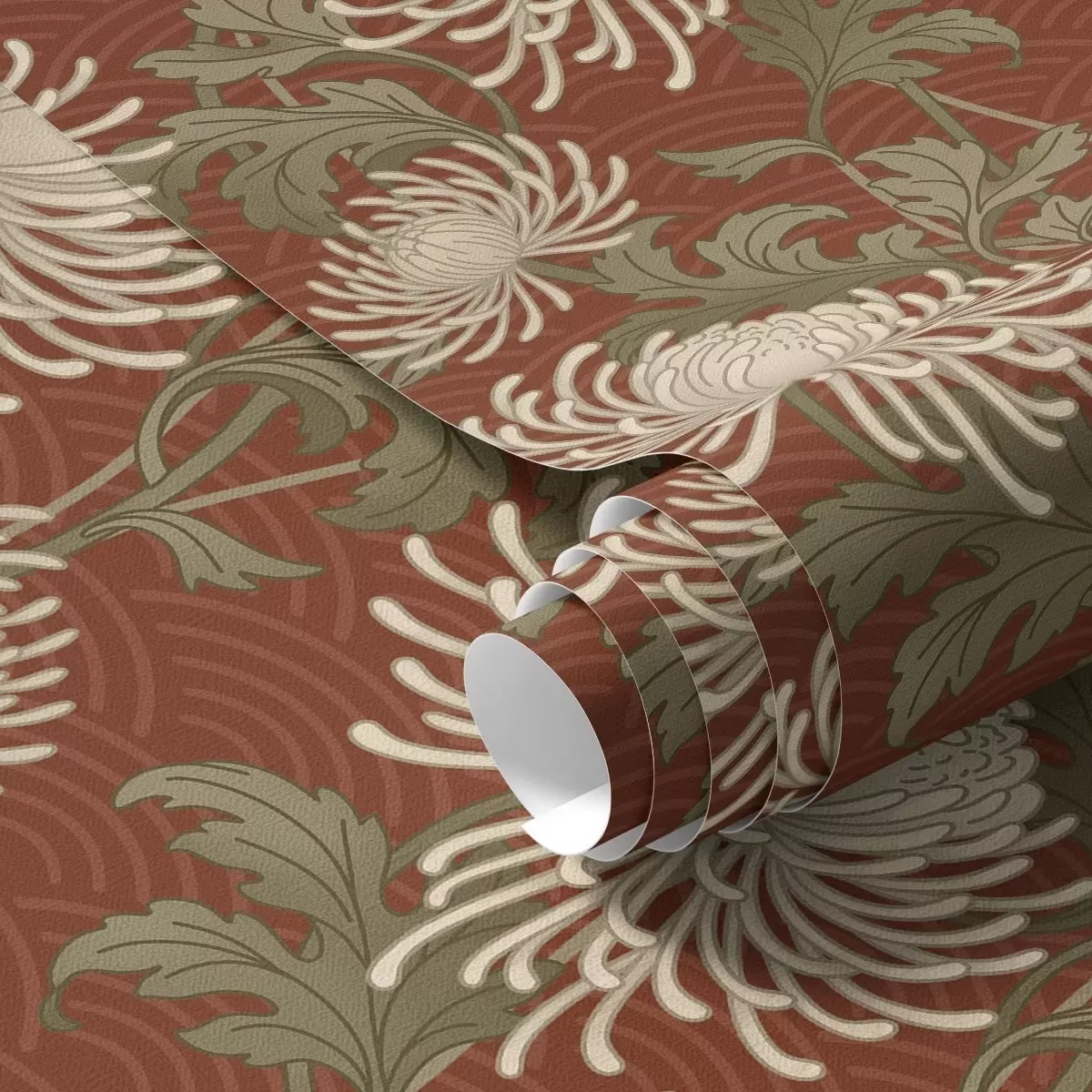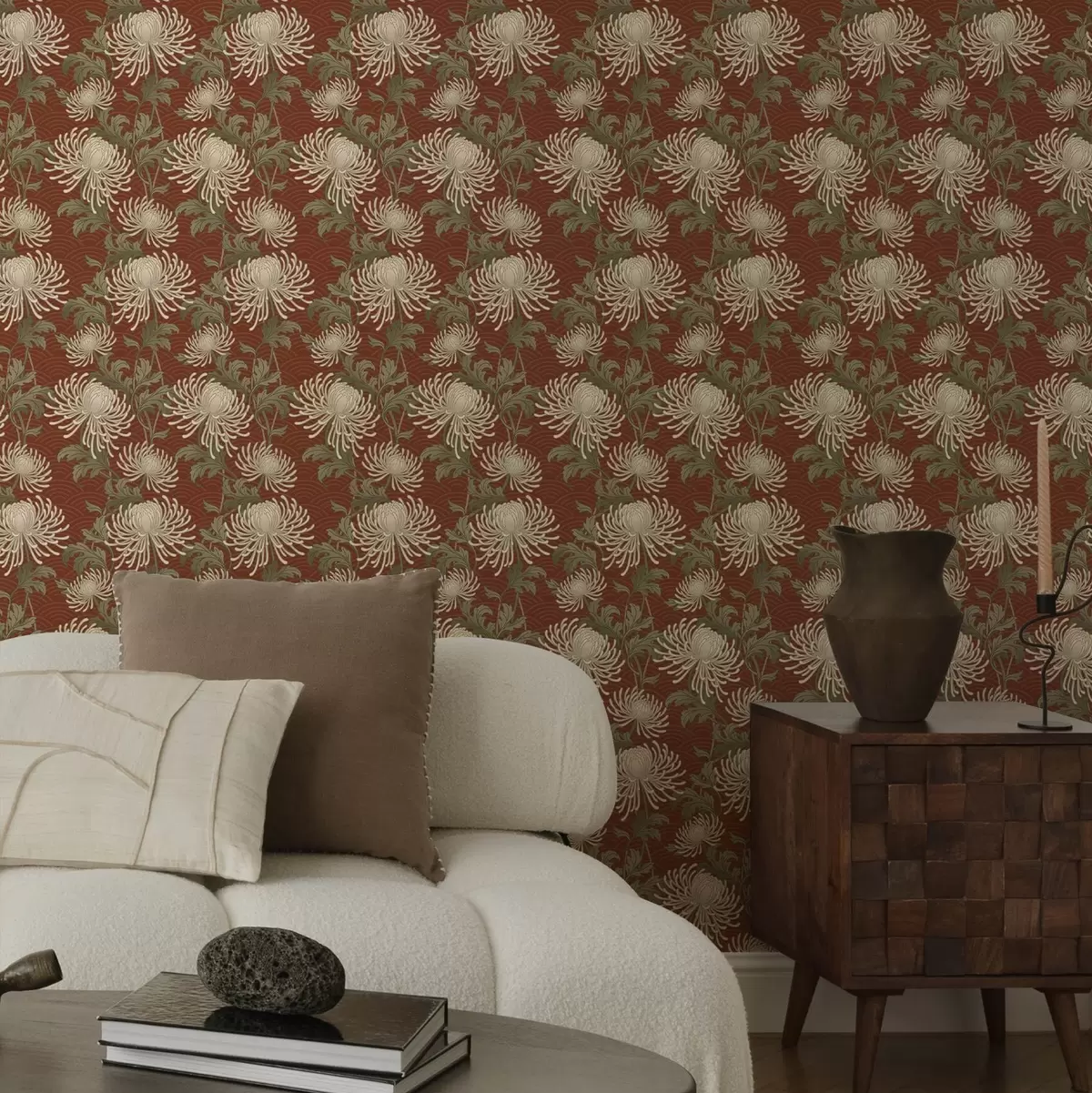 Tapet Kremfargede krysantemum på terrakottafarget bakgrunn, asiatisk stil Nr. a00693