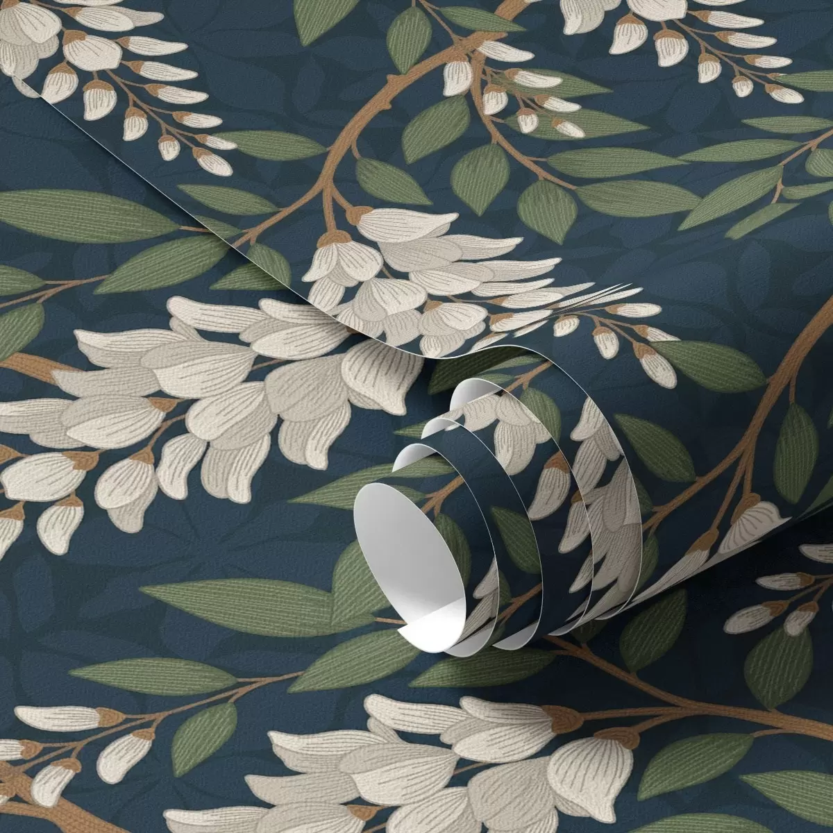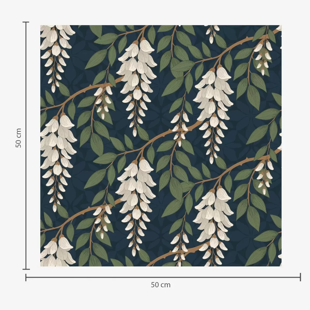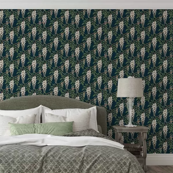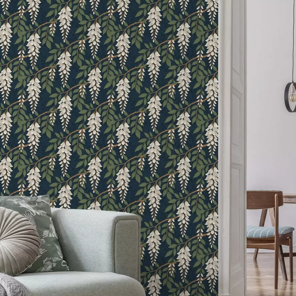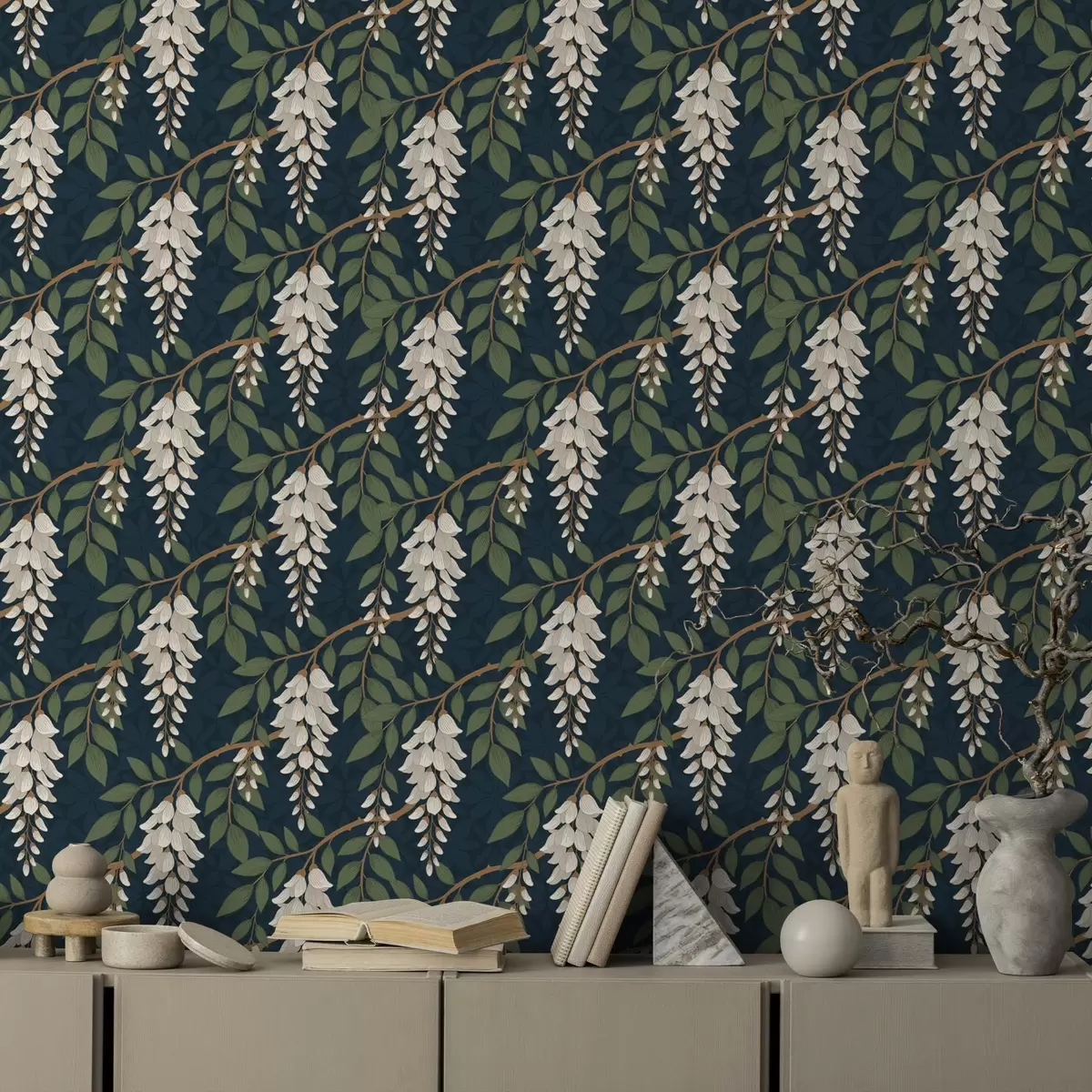 Tapet Elfenbenfarget blåregn på en dyp blågrønn bakgrunn Nr. a00694v1