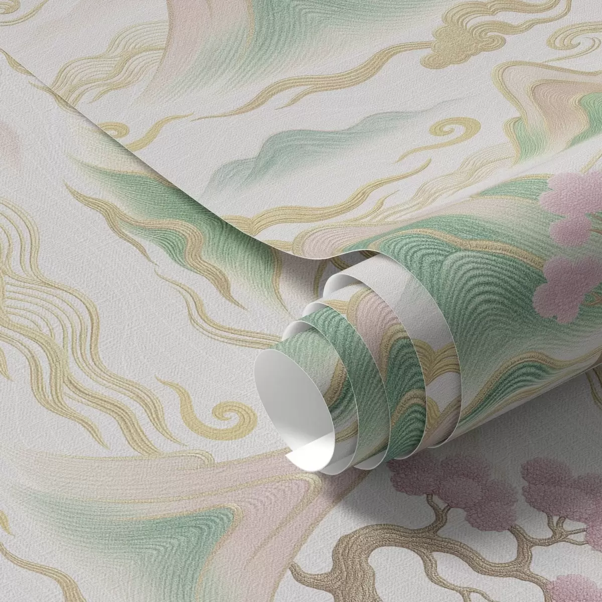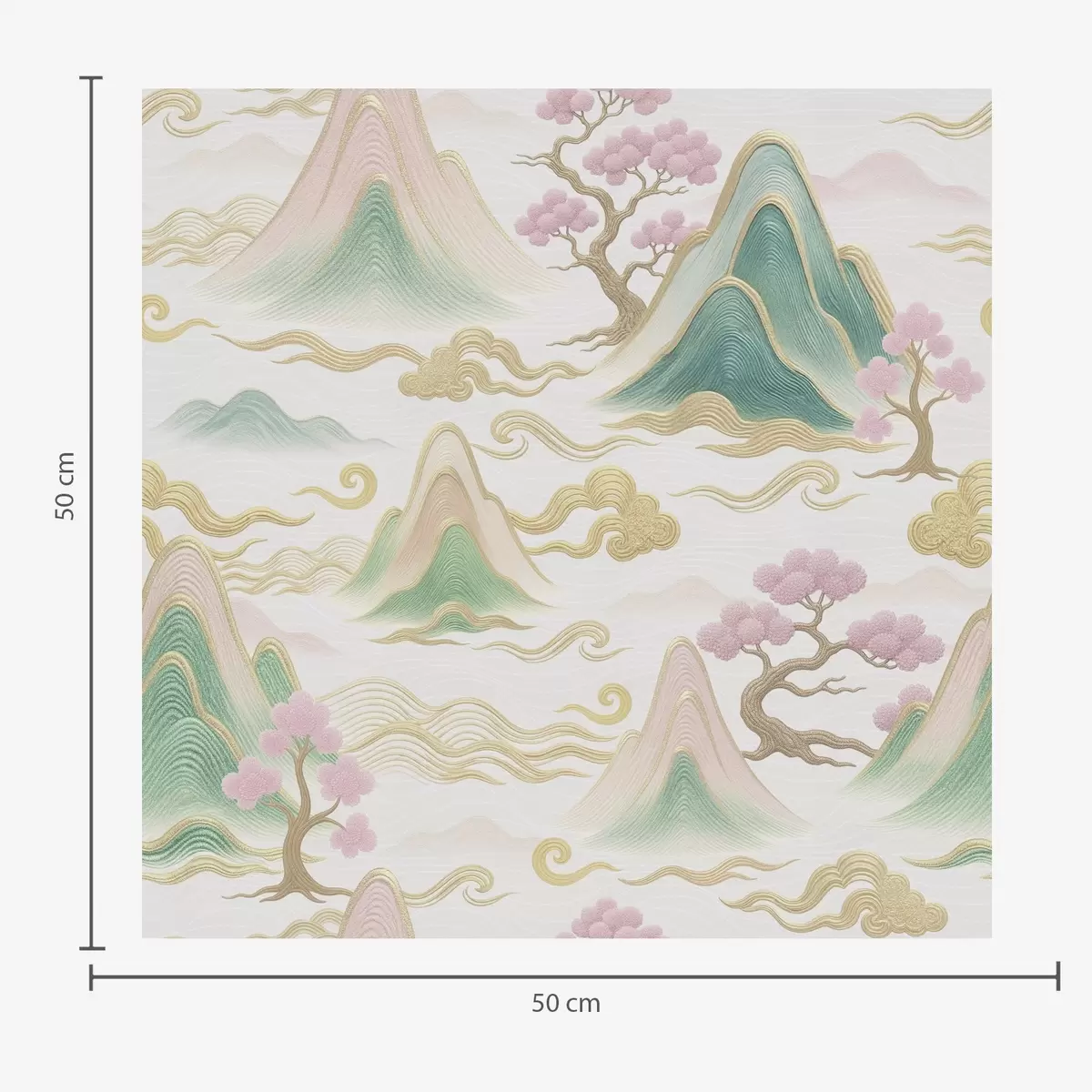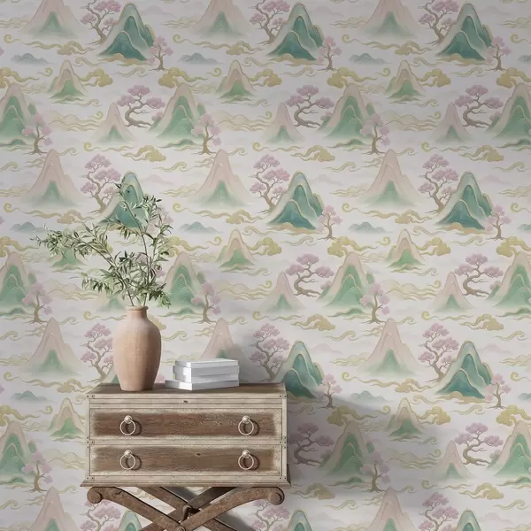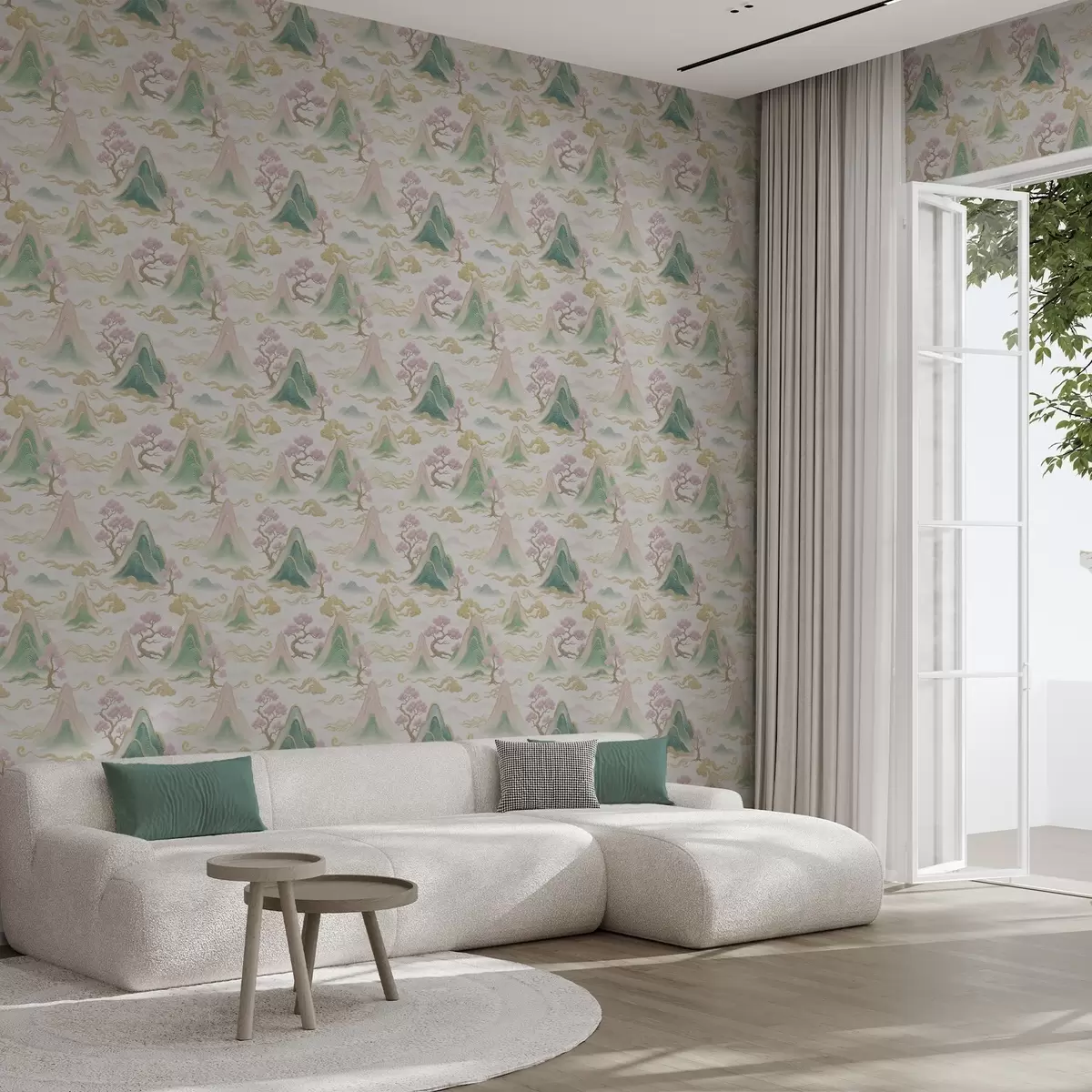 Tapet Fjell, skyer og furutrær i orientalsk dekorativ stil Nr. a00703