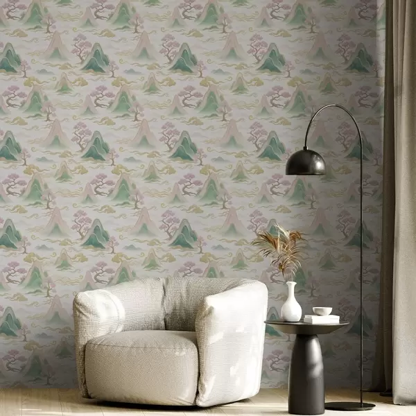 Tapet Fjell, skyer og furutrær i orientalsk dekorativ stil Nr. a00703