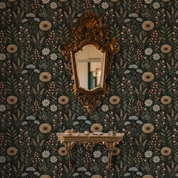 Tapet Villblomster og bær på mørk bakgrunn, naturlig ornament Nr. a00707