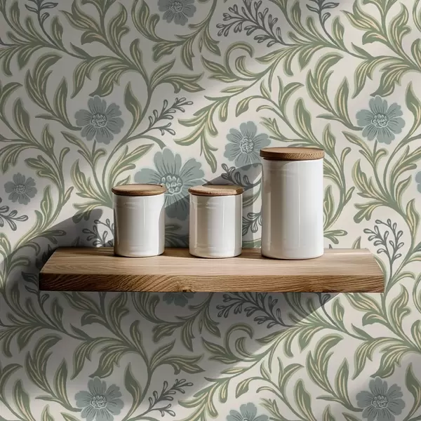 Tapet Salviegrå blomsterornament på lys bakgrunn Nr. a00712
