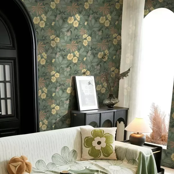 Tapet Gule blomster blant grønne, bladrike teksturer Nr. a00718
