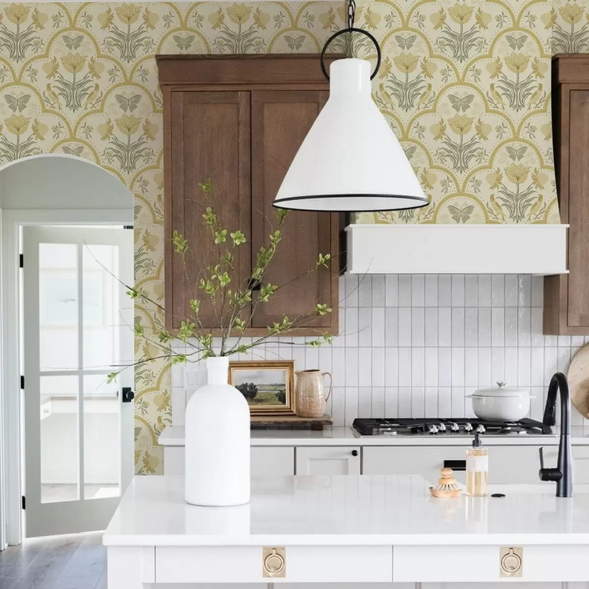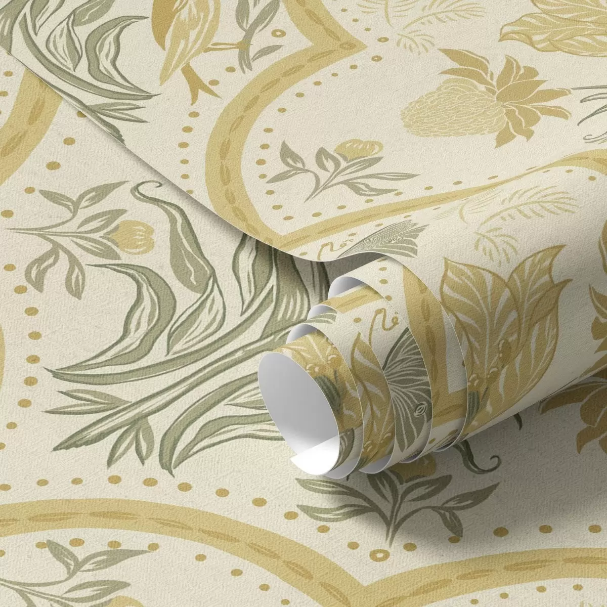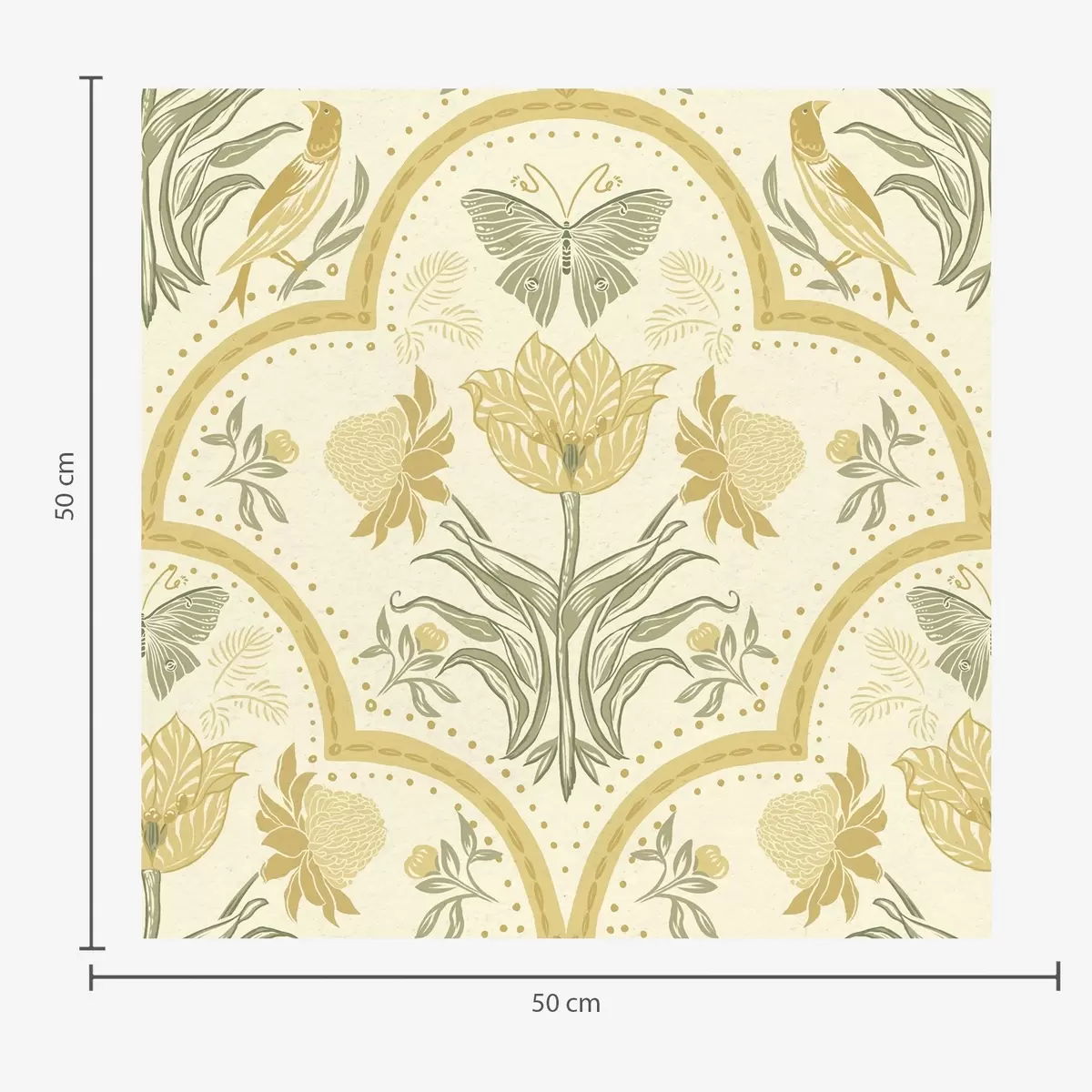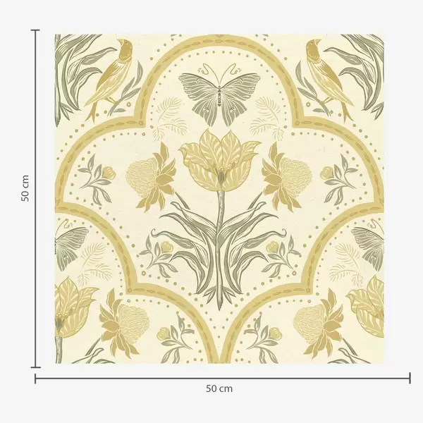 Tapet Ornament med tulipan, fugler og sommerfugler, oker Nr. a00722