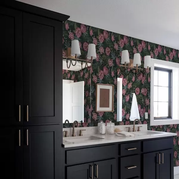 Tapet Mørk flora med rosa blomster og blader, mørk bakgrunn Nr. a00724