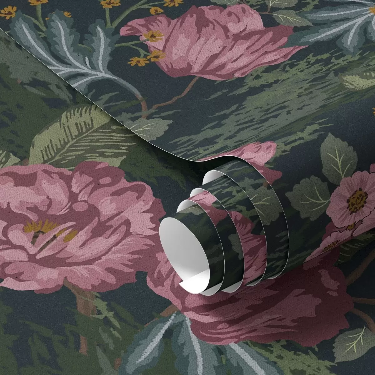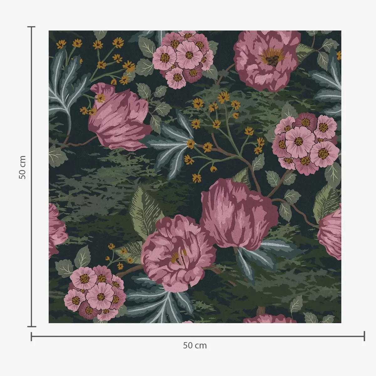 Tapet Mørk flora med rosa blomster og blader, mørk bakgrunn Nr. a00724