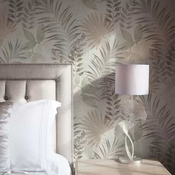 Tapet Pastellfargede tropiske blader på lys bakgrunn, subtil tekstur Nr. a00725