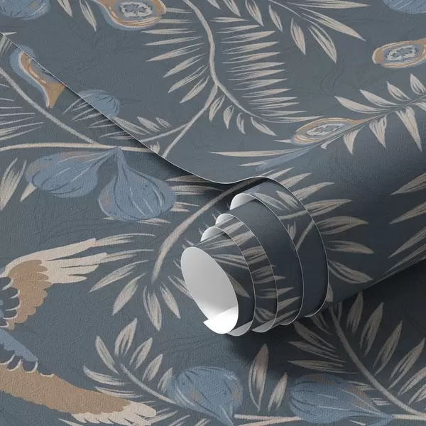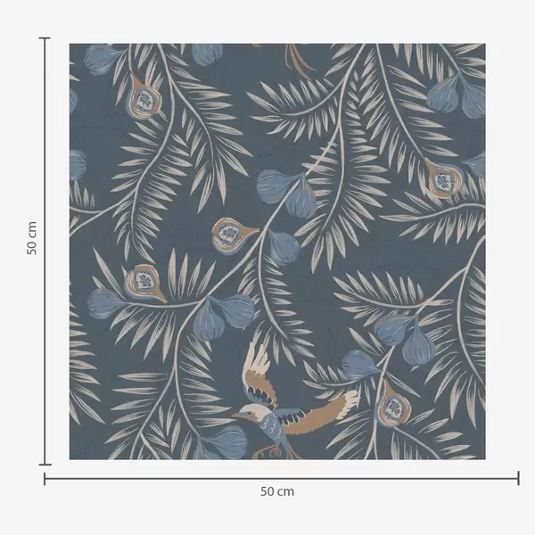 Tapet Fugl blant blå frukter og palmeblader, indigo Nr. a00726