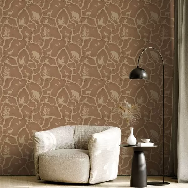 Tapet Silhuetter av dyr og trær i et naturlig landskap med steinstruktur Nr. a00727