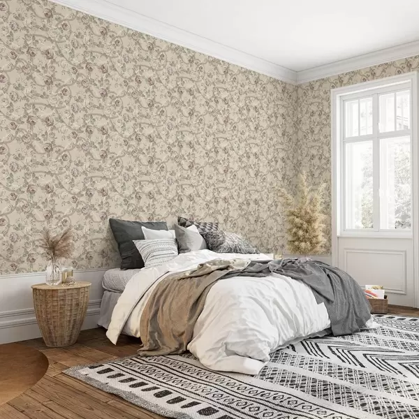 Tapet Roser med grønne blader på en varm beige bakgrunn Nr. a00729