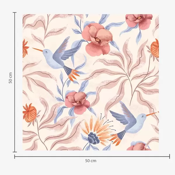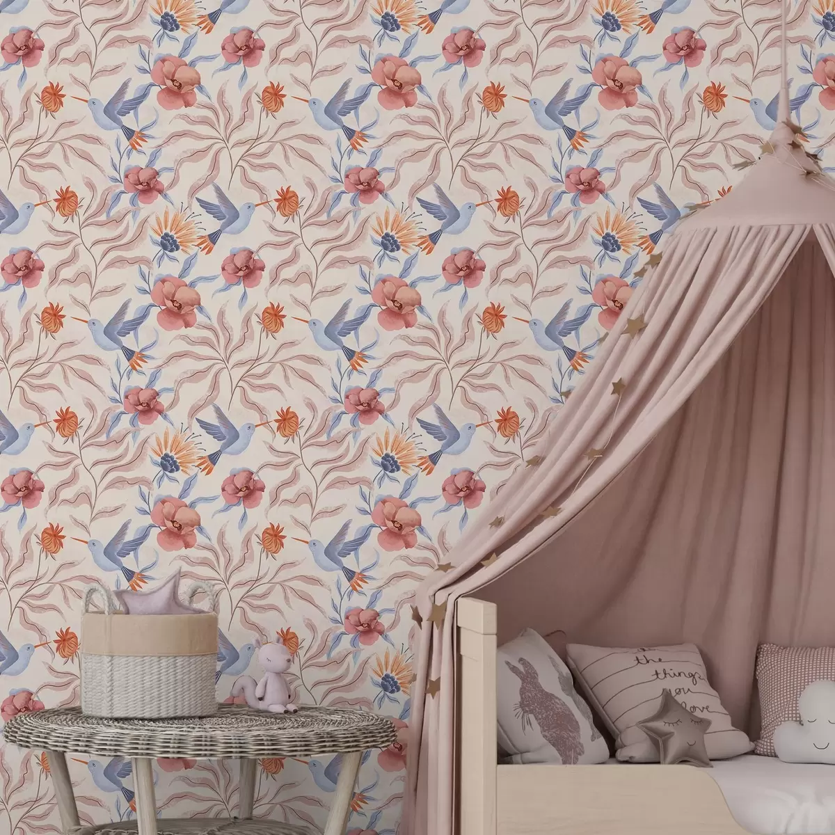 Tapet Kolibrier blant store blomster i rosa og blå toner Nr. a00733