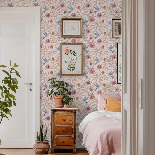 Tapet Kolibrier blant store blomster i rosa og blå toner Nr. a00733