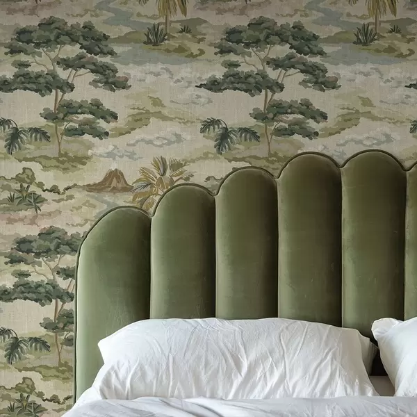 Tapet Landskap med elv, trær og palmer i myke farger Nr. a00736