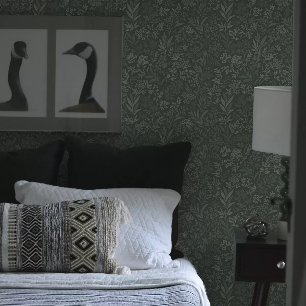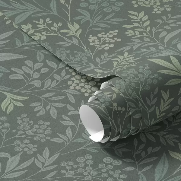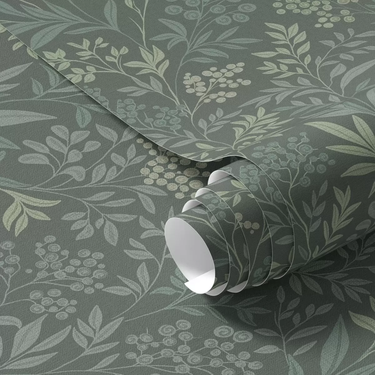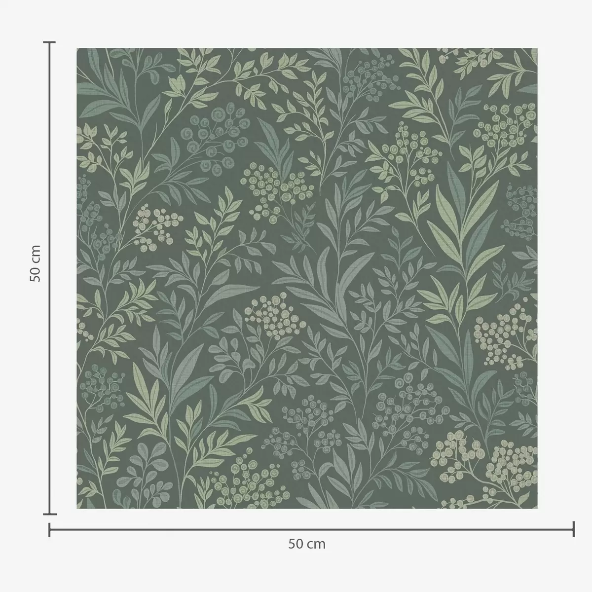 Tapet Smaragdgrønt gress og bær, fint botanisk mønster Nr. a00740