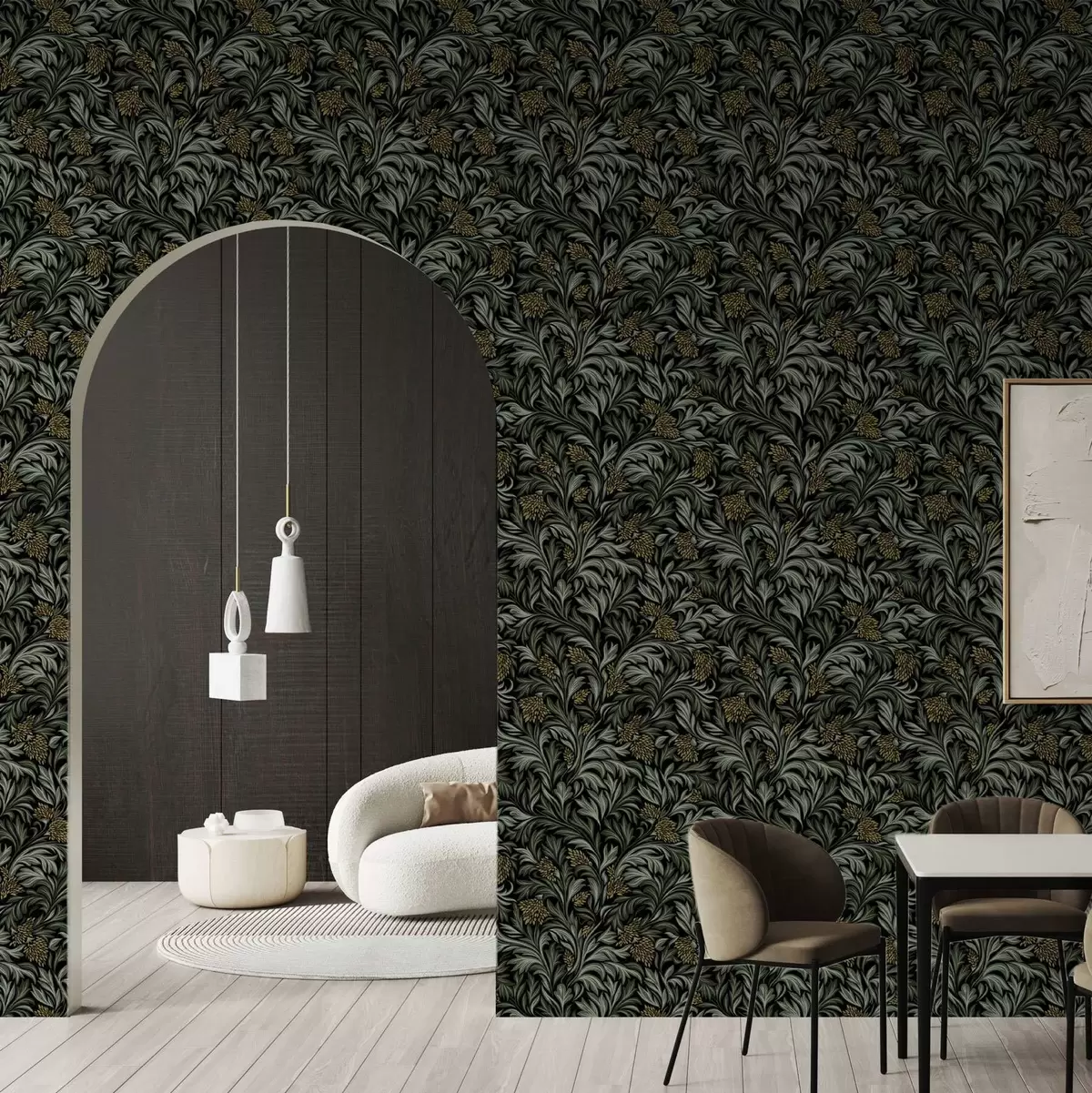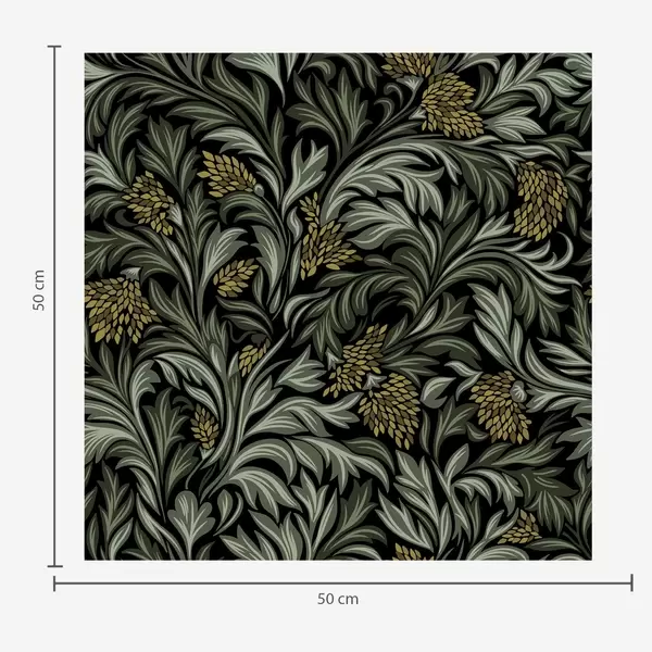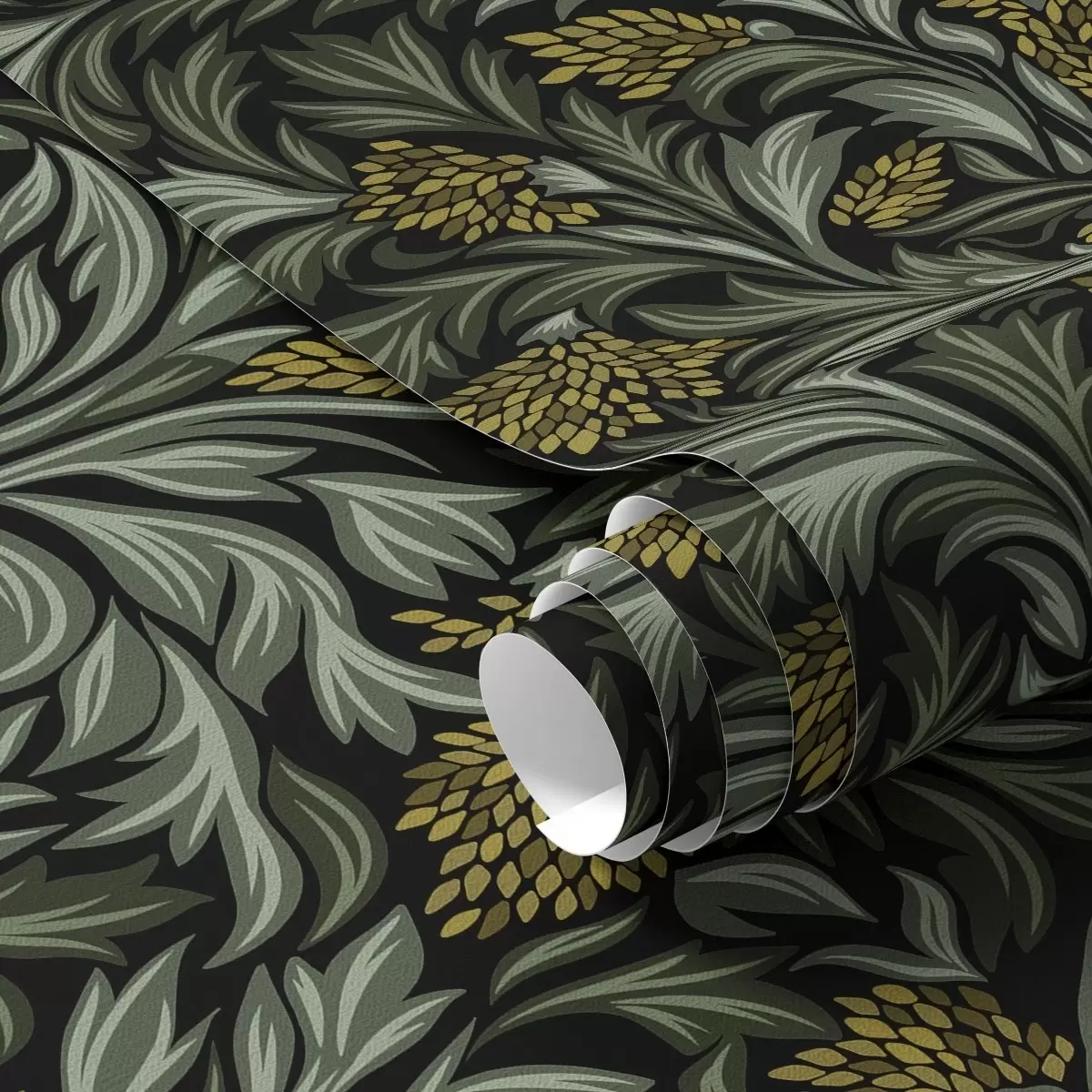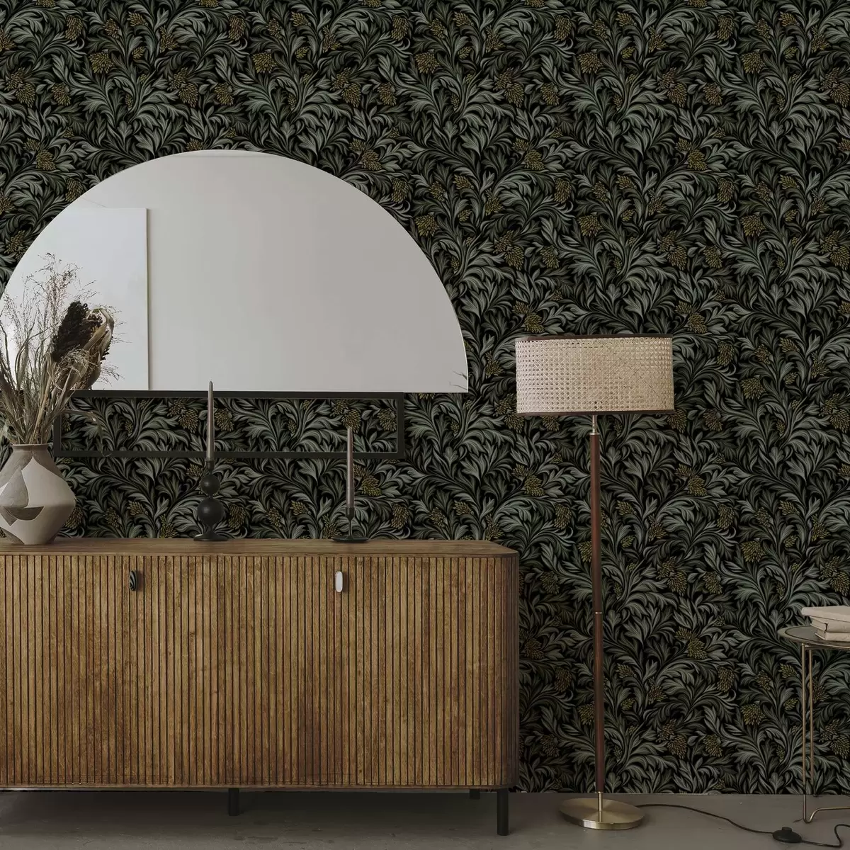 Tapet Mørke akantusblader med gule kjegler på svart bakgrunn Nr. a00745