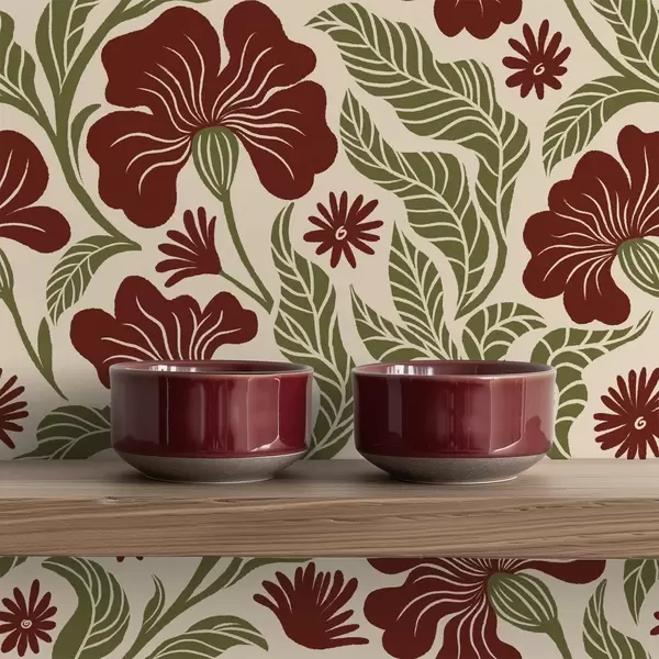Tapet Burgunderblomster med grønne blader på lys bakgrunn Nr. a00761
