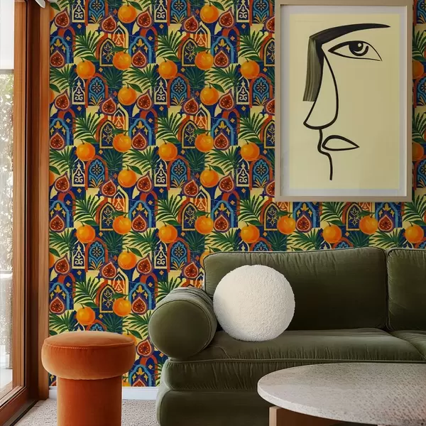 Tapet Lyse appelsiner, palmeblader og marokkanske buer Nr. a00767