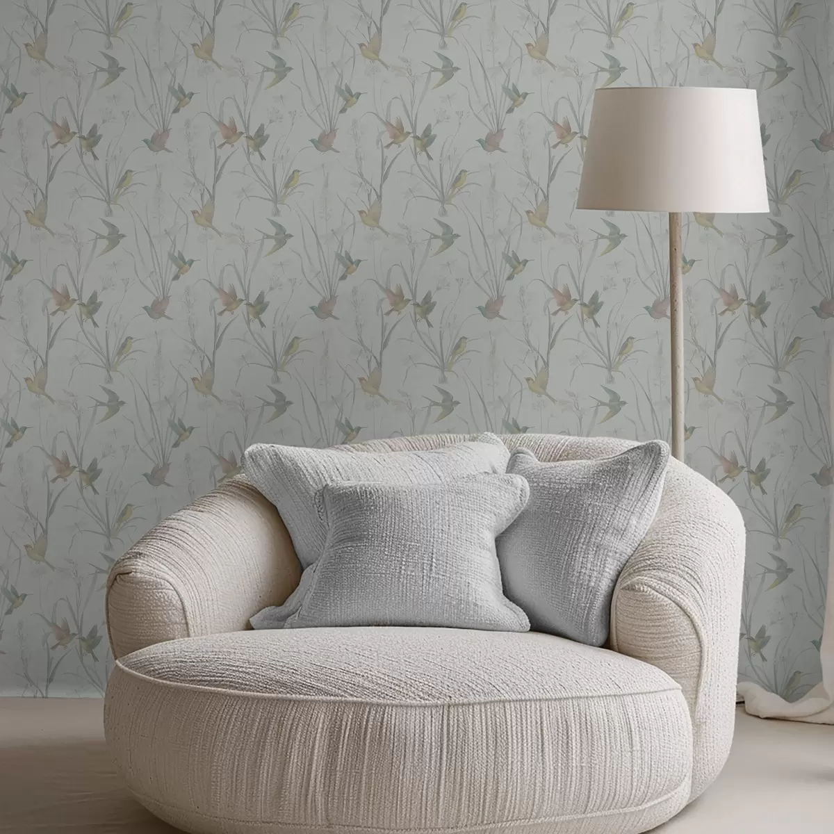 Tapet Fugler blant engblomster på lysegrå bakgrunn Nr. a00776v1