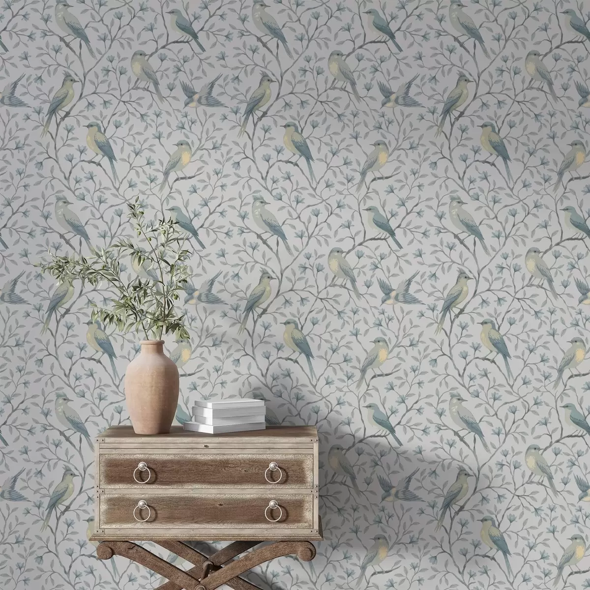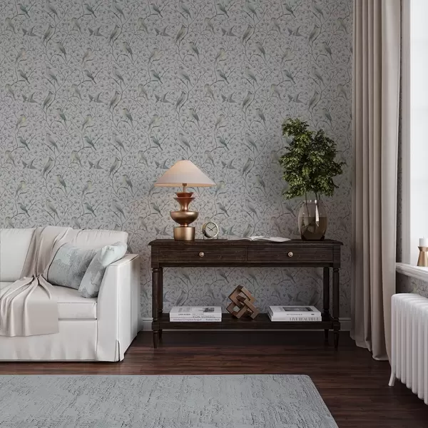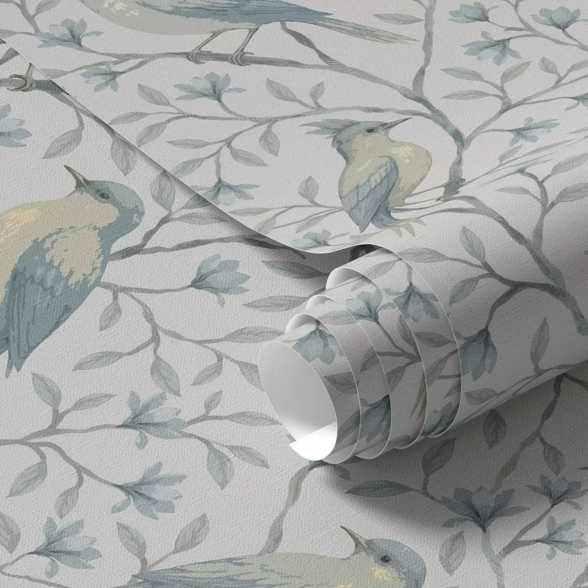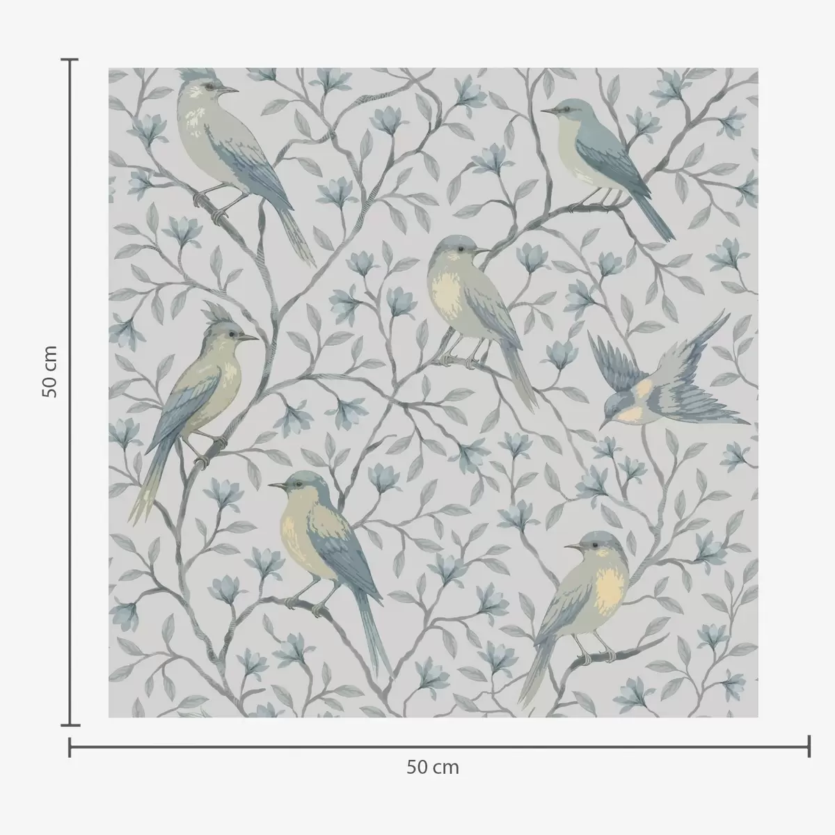 Tapet Fugler på grener, gråblå farger Nr. a00782
