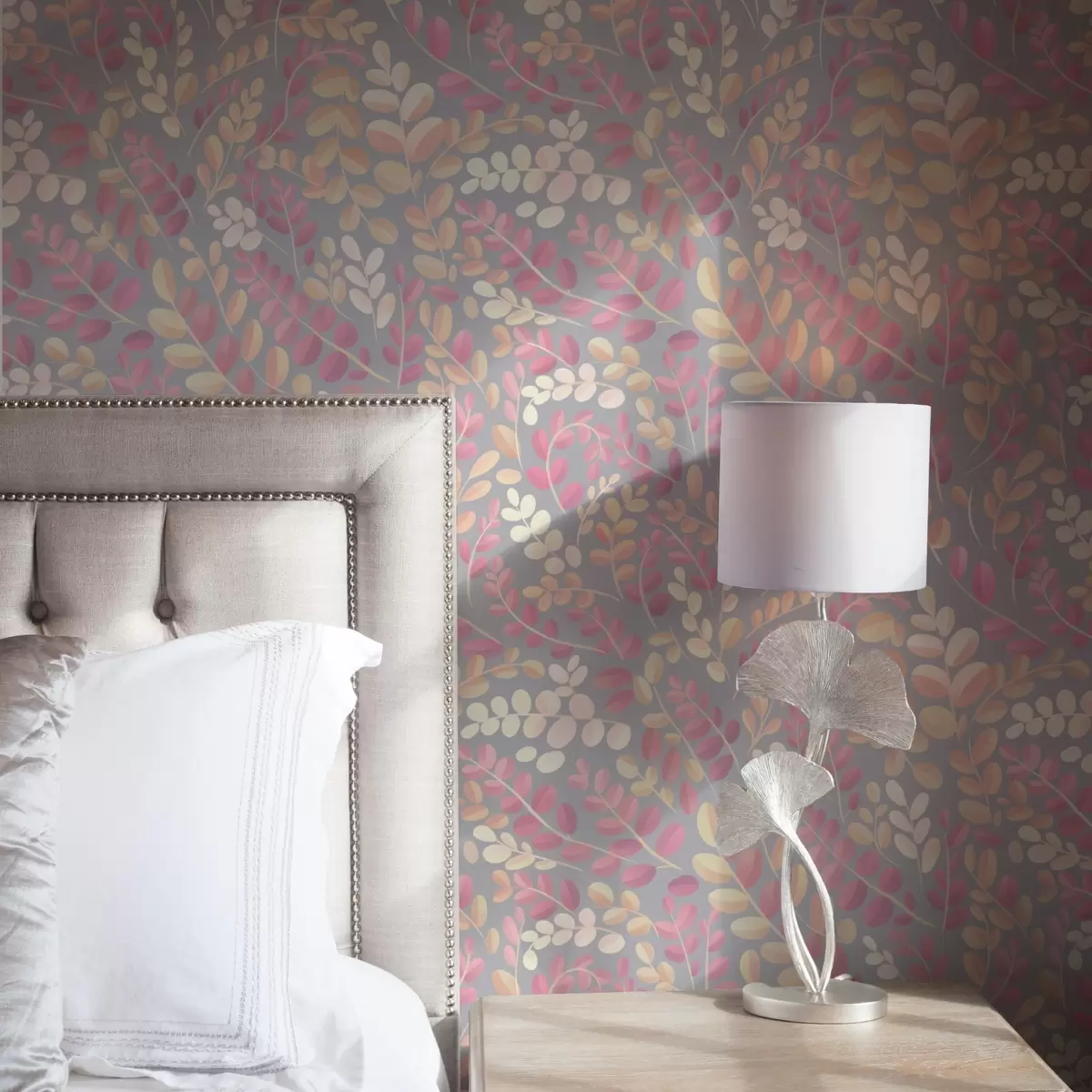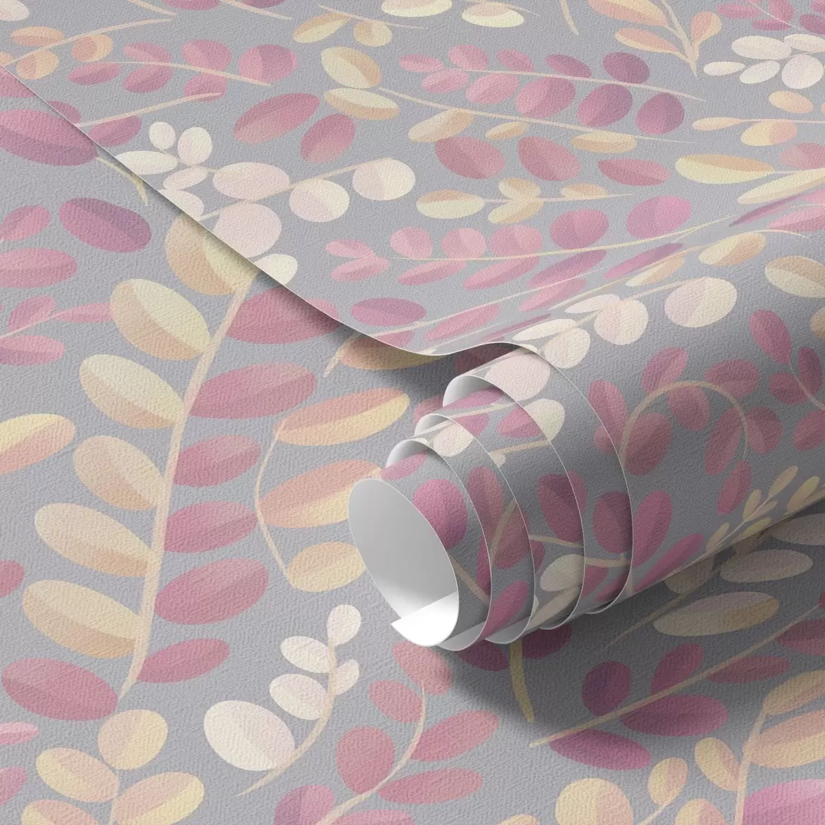 Tapet Pastellfargede grener med rosa-ferskenfarget løvverk på grå bakgrunn Nr. a00799v1