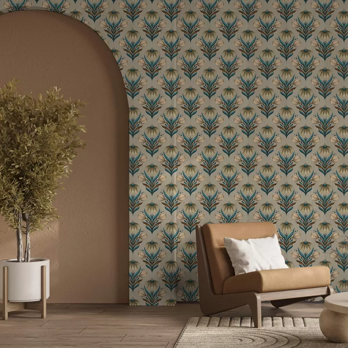 Tapet Symmetrisk blomsterornament i varme farger Nr. a00812